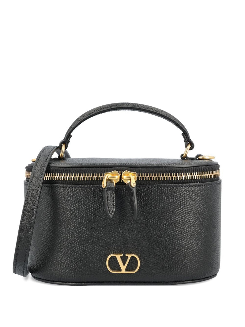 Discover a compact leather vanity case that balances polished VLogo hardware with a textured grain finish to protect essentials while traveling. The top handle and adjustable removable shoulder strap offer versatile carry options, and a secure zip closure with one internal card slot keeps small items organized. Designed for adults seeking refined storage, this piece compares well with other structured shoulder bags for everyday or event use.