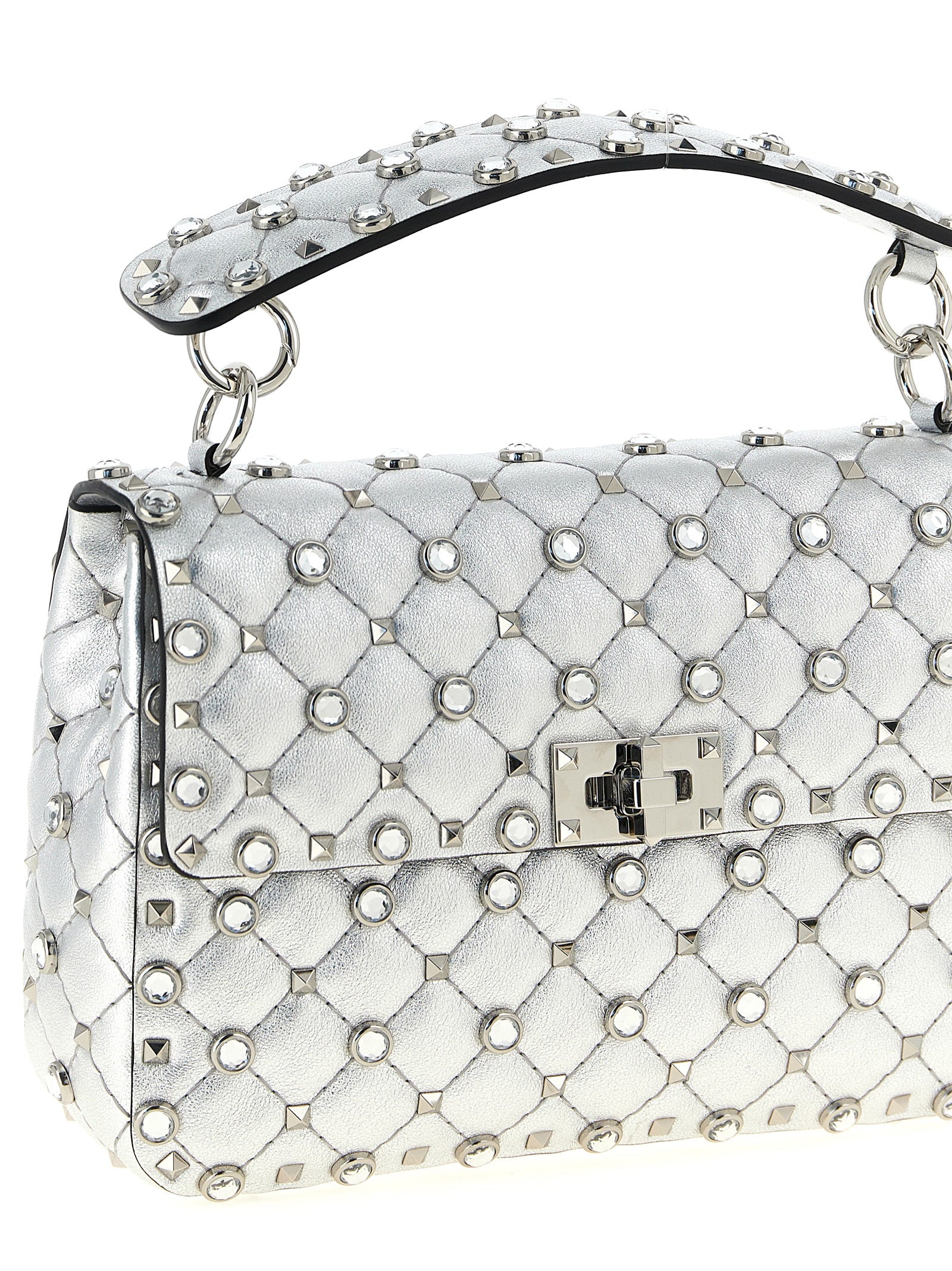 'rockstud spike' shoulder bag in laminated soft nappa leather with metalicche studs and all-over cabochon, Flap closure with metal spin, Removable handle, Nappa lining, Two inner pockets, Removable chain shoulder strap. Size and Fit - W 24 x h 16 x d 7 cmMade in: Italy