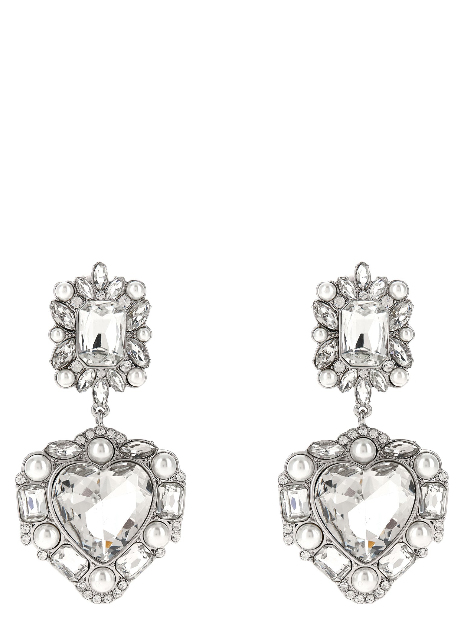 Crystal pearl tiered heart' earrings in silver-plated brass with fake pearls and applied crystals, Butterfly closure._x000d_ item cannot be returned. Size and Fit - W 3.8 x H 6.75 cm