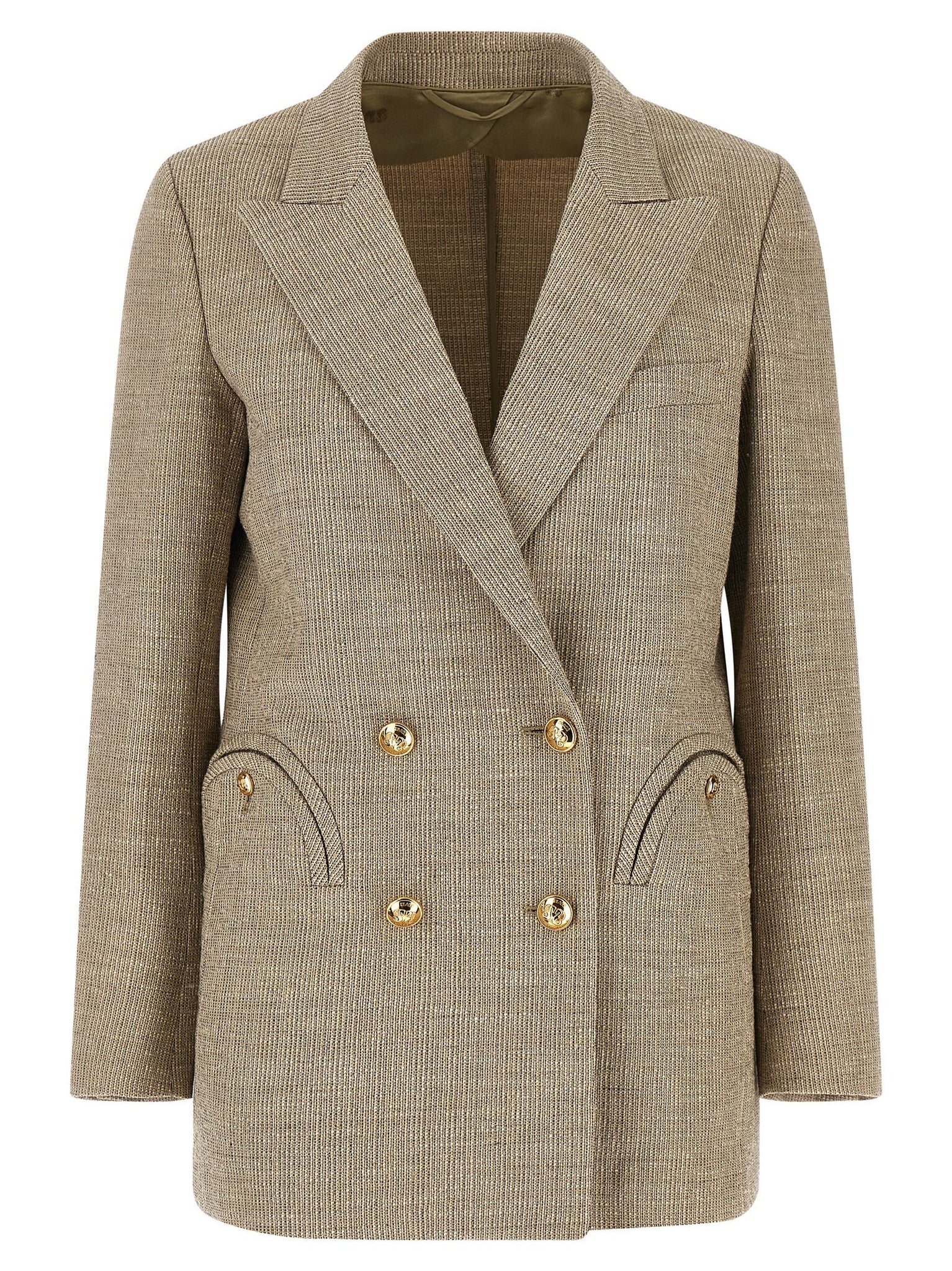 'marisa' double-breasted linen jacquard blazer with peak lapels, Gold-finish metal button closure, Pockets, Padded shoulders, Long sleeves with buttons, Back vent. Size and Fit - True to size fitMade in: Italy