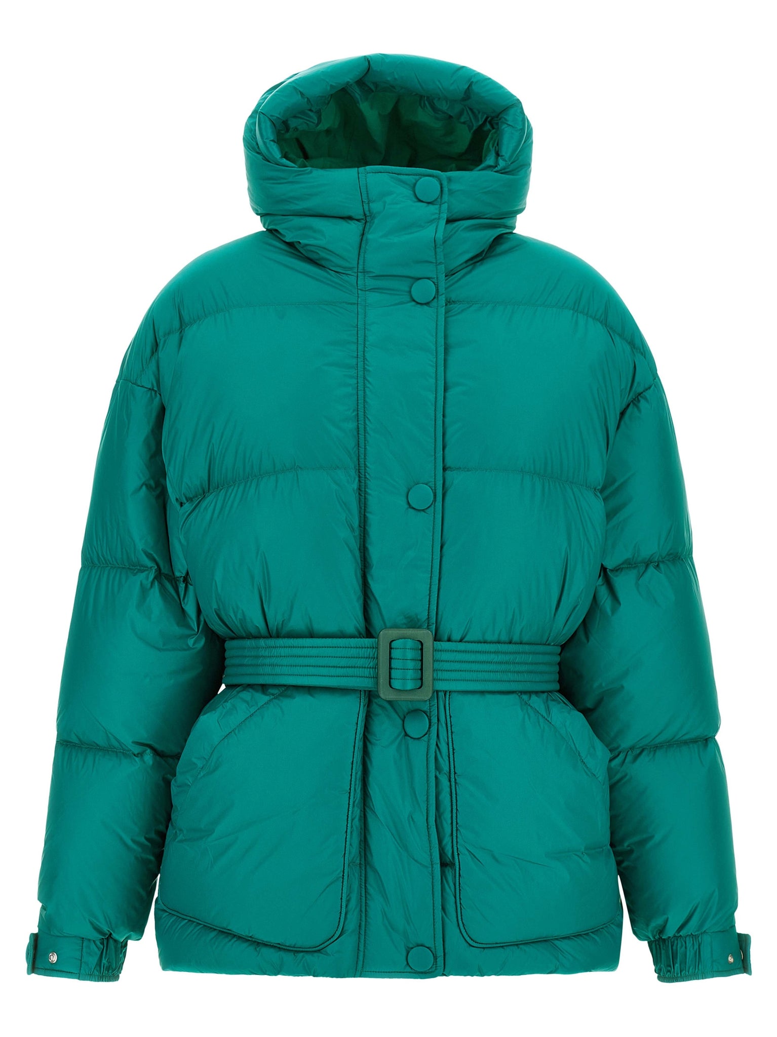 'michlin' quilted nylon powder down jacket with goose down padding, Cotton lining, Hood, High neck, Front zip and snap button closure, Pockets, Long sleeves with adjustable elastic cuffs and dropped shoulder, Hourglass silhouette with removable belt at the waist. Size and Fit - true to size fitMade in: Ukraine