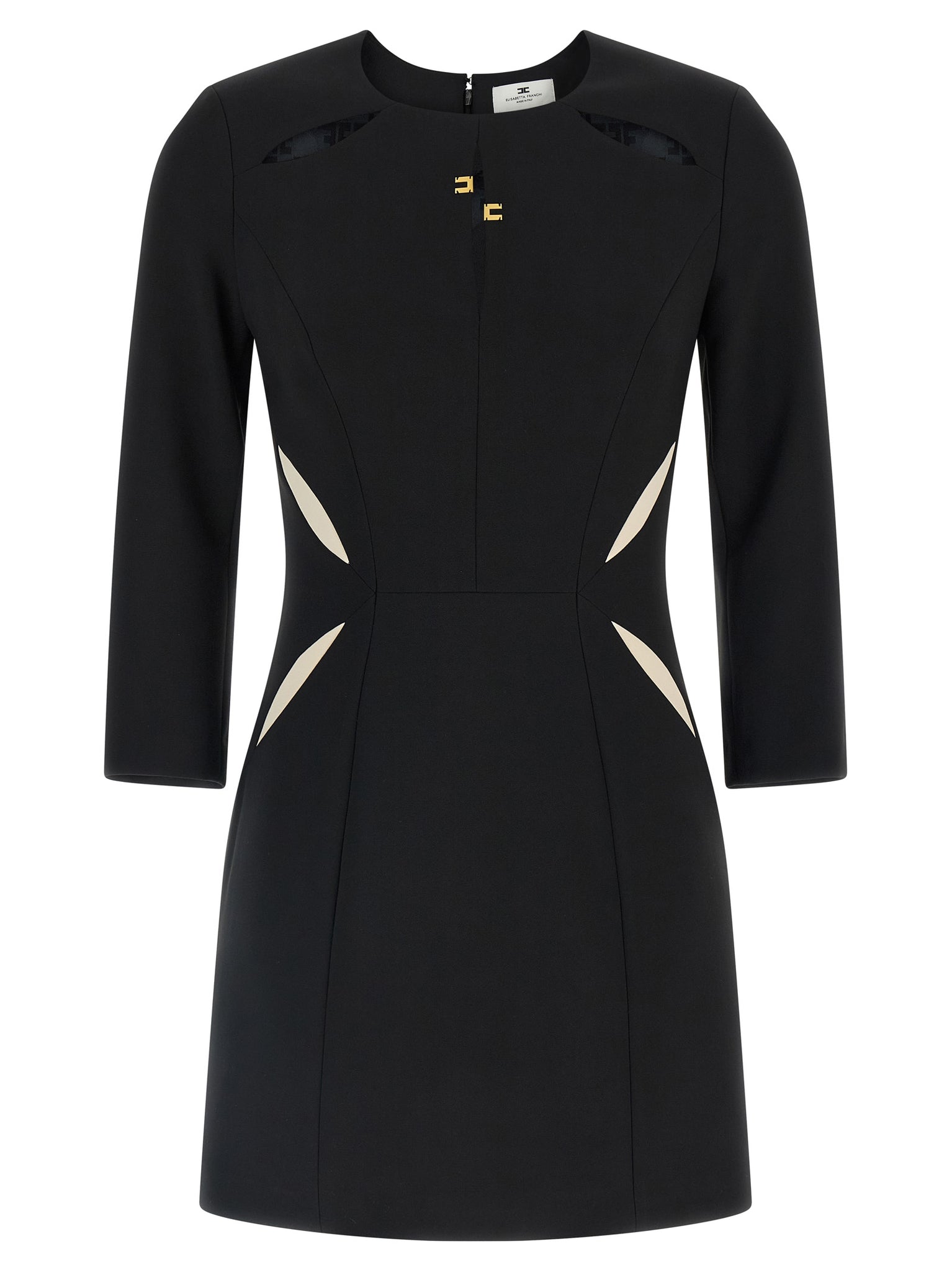 Sheath mini dress with crewneck with cut-out details at the top and contrasting inserts at the waist, Metal front detail with logo, Concealed zip back closure, And long sleeves. Size and Fit - True to size fit