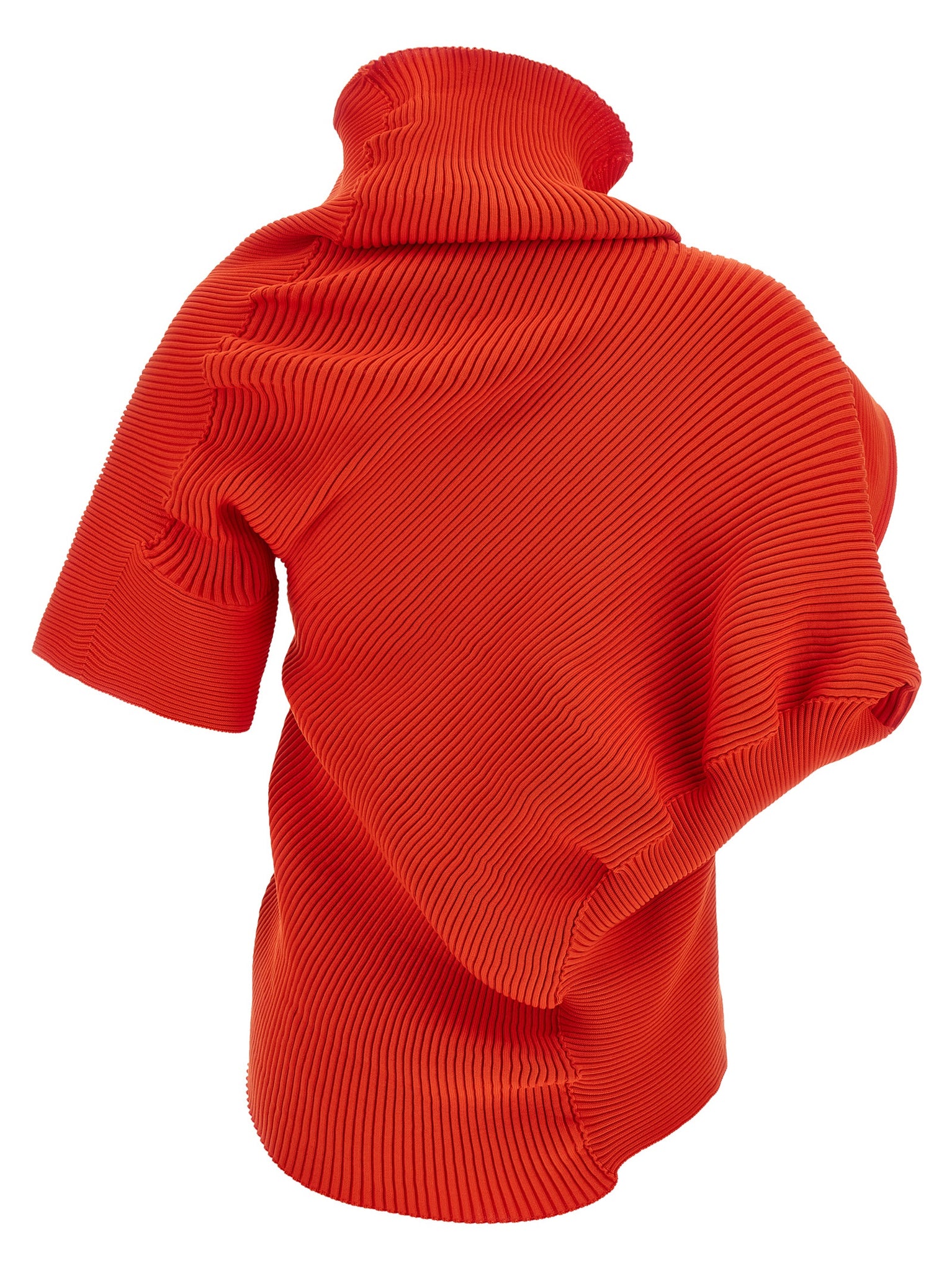 Discover a streamlined silhouette in the Issey Miyake Life Form Top, a red stretch-knit piece that combines tubular shaping with an asymmetric cut for modern polish. The wide high neck and beveled short sleeves create architectural interest while the ribbed pattern provides subtle texture and comfortable stretch. Designed true to size, this top offers easy layering and a refined profile for everyday wear.