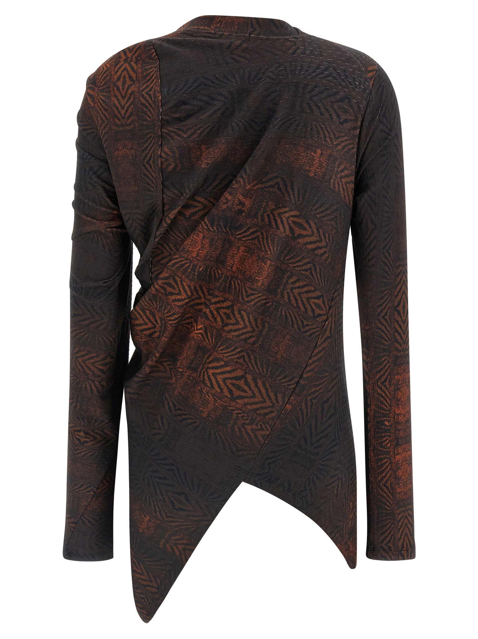 'simpson' top in cotton jersey with custom print with feathers, Asymmetrical construction with front and back draping, Round neckline, Long sleeves, Asymmetrical hem. Size and Fit - Slim fit
