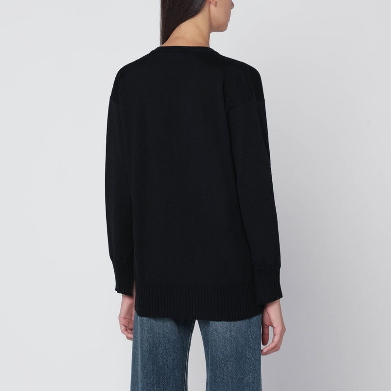 Roberto Collina''s black merino wool sweater, characterized by a V-neck, split cuffs, and ribbed hem. Size and Fit - La modella indossa la taglia S Misure modella: Altezza: 178 cm Petto: 83 cm Vita: 63 cm Fianchi: 91 cm