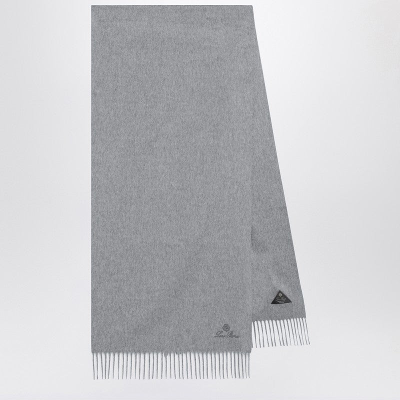 Light grey cashmere scarf by Loro Piana, characterized by edges with small fringes and tone-on-tone logo lettering embroidery.