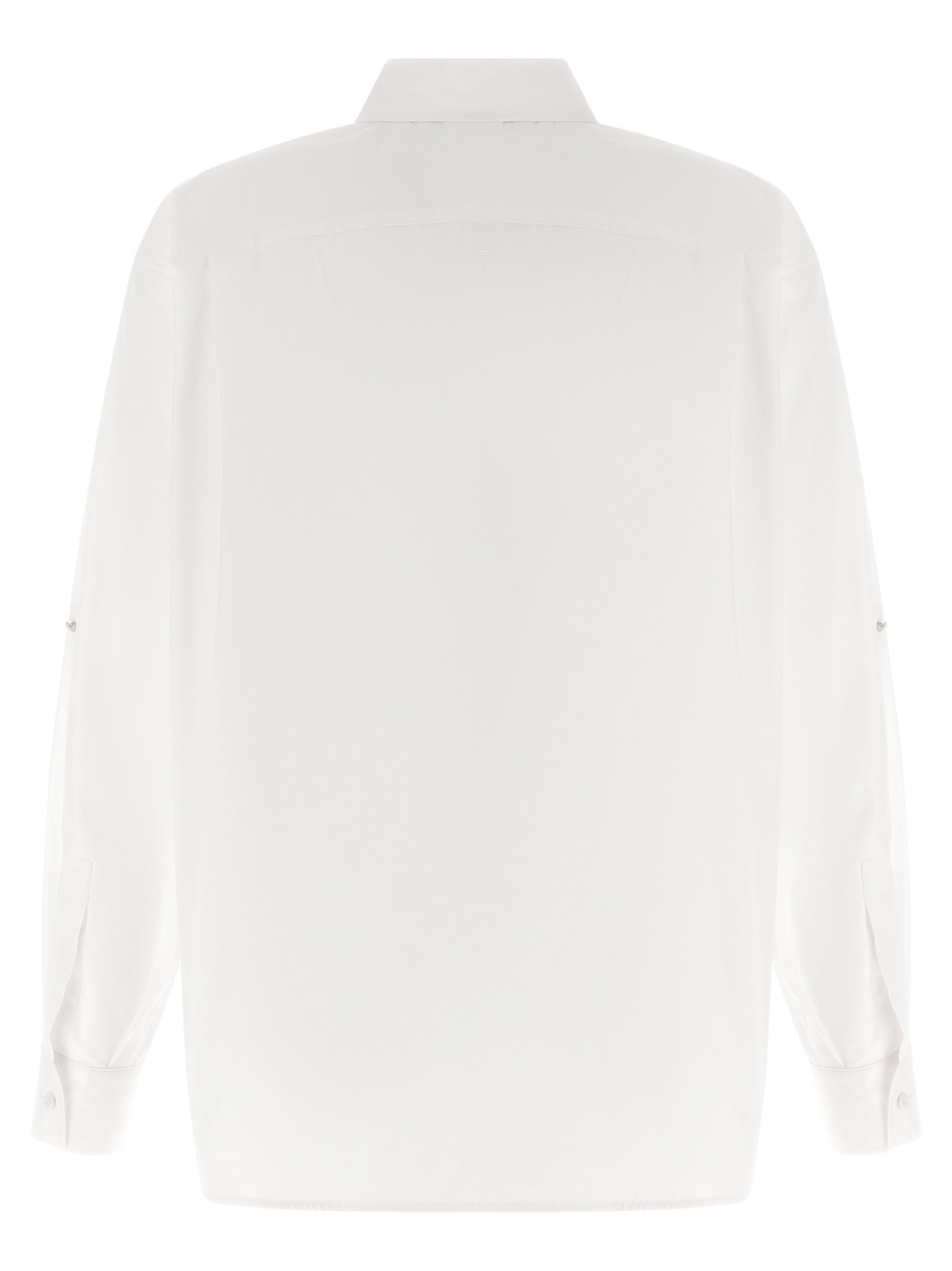 'mxmtenue' cotton poplin shirt with pointed collar, Concealed front covered button closure, Pockets, Long sleeves with foldable cuffs and dropped shoulder, Side slits, Asymmetrical and rounded hem. Size and Fit - oversized fitMade in: Italy