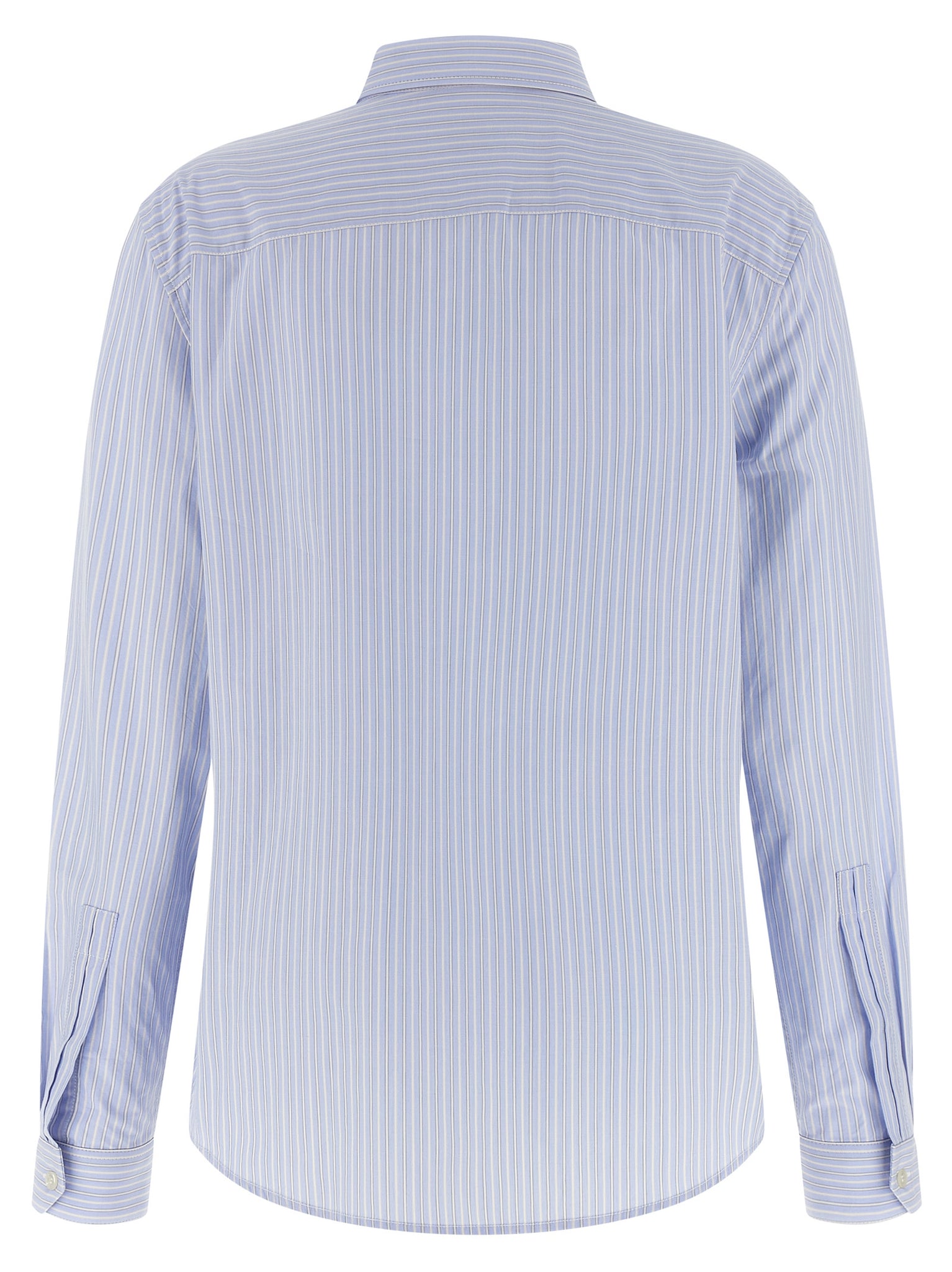 Discover a light blue striped cotton poplin shirt that balances polished tailoring with everyday comfort. The pointed collar and mother-of-pearl front buttons present a refined silhouette while the breast pocket features subtle 'cassandre' embroidery for signature detail. Long sleeves finish with one-button beveled cuffs and a rounded hem, offering effortless layering and a true-to-size French fit.