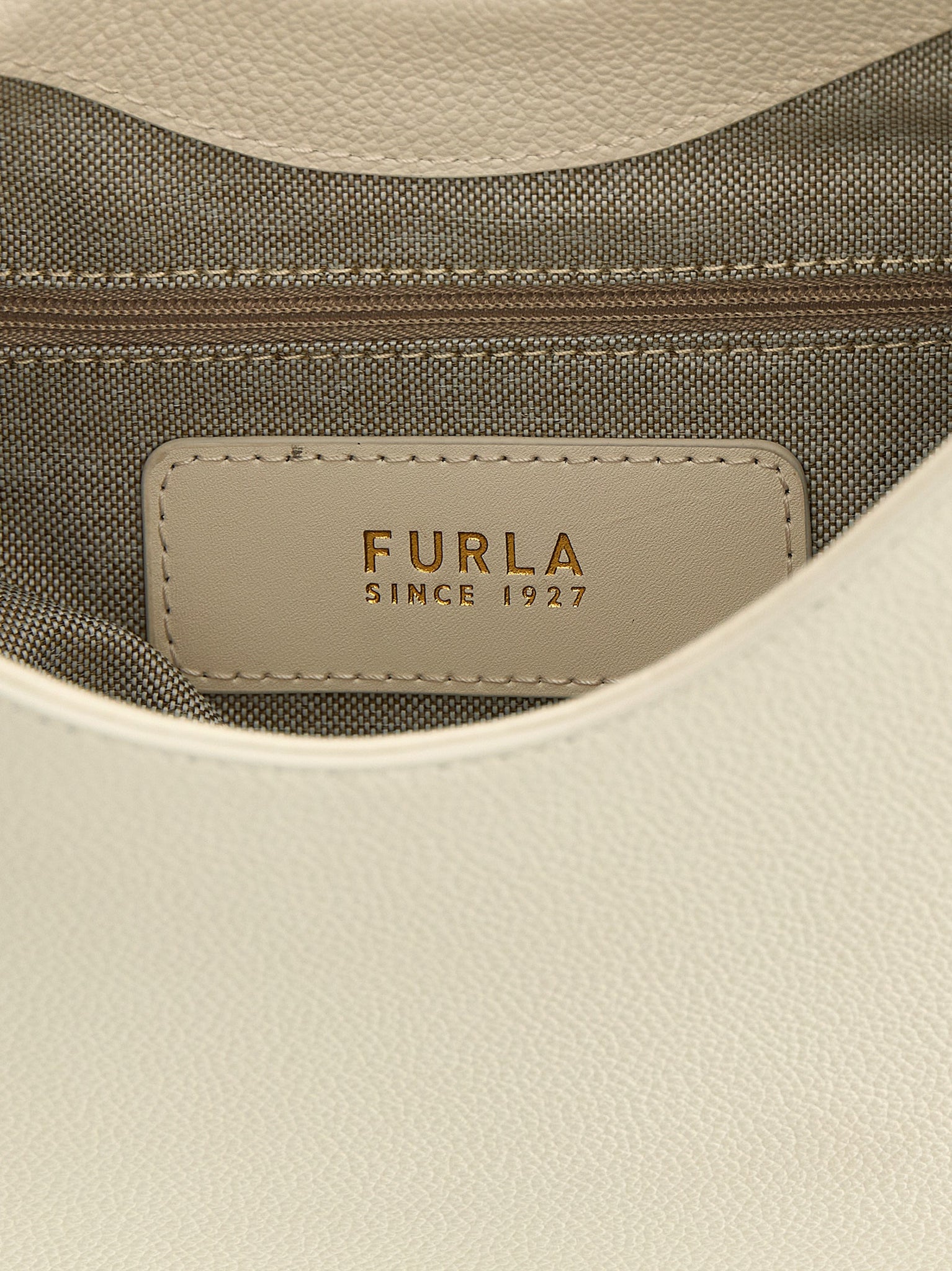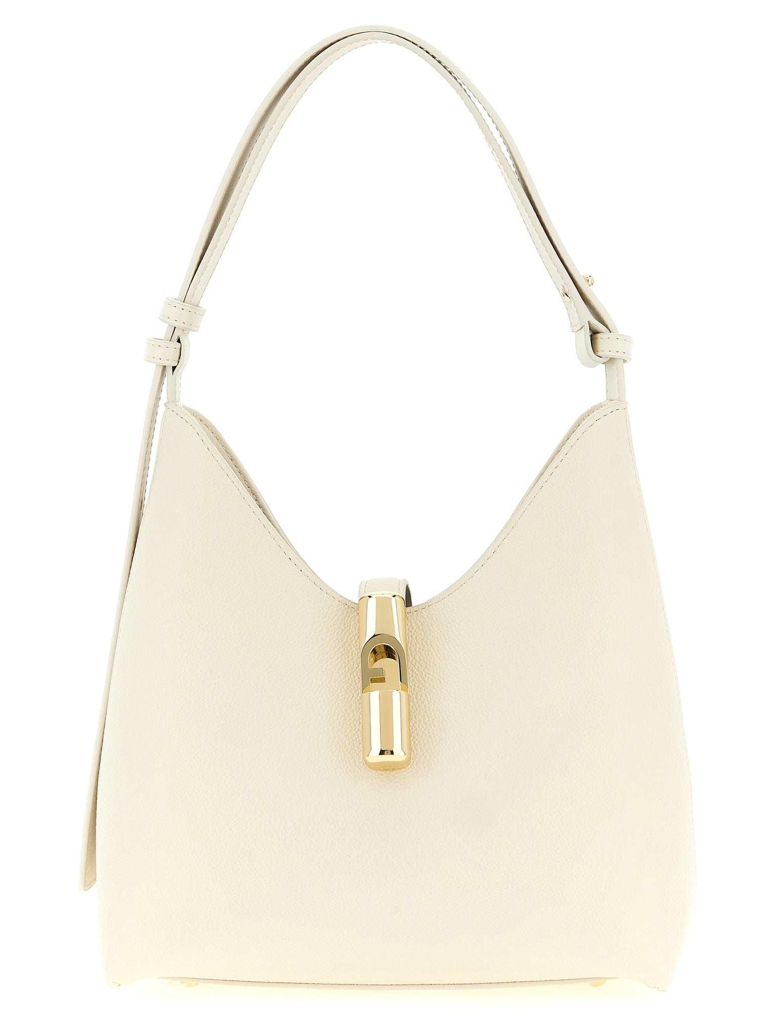 The Furla Goccia Small Shoulder Bag in white offers a soft, unstructured hobo silhouette crafted from smooth leather and printed midnight calfskin for refined contrast. Its cylindrical hardware closure with carved "arco furla" logo and rigid base with metal feet combine secure wear with lasting shape. An adjustable handle, two inner pockets and lined interior make organization simple while dimensions W 24 x H 24 x D 12 cm suit everyday carry.