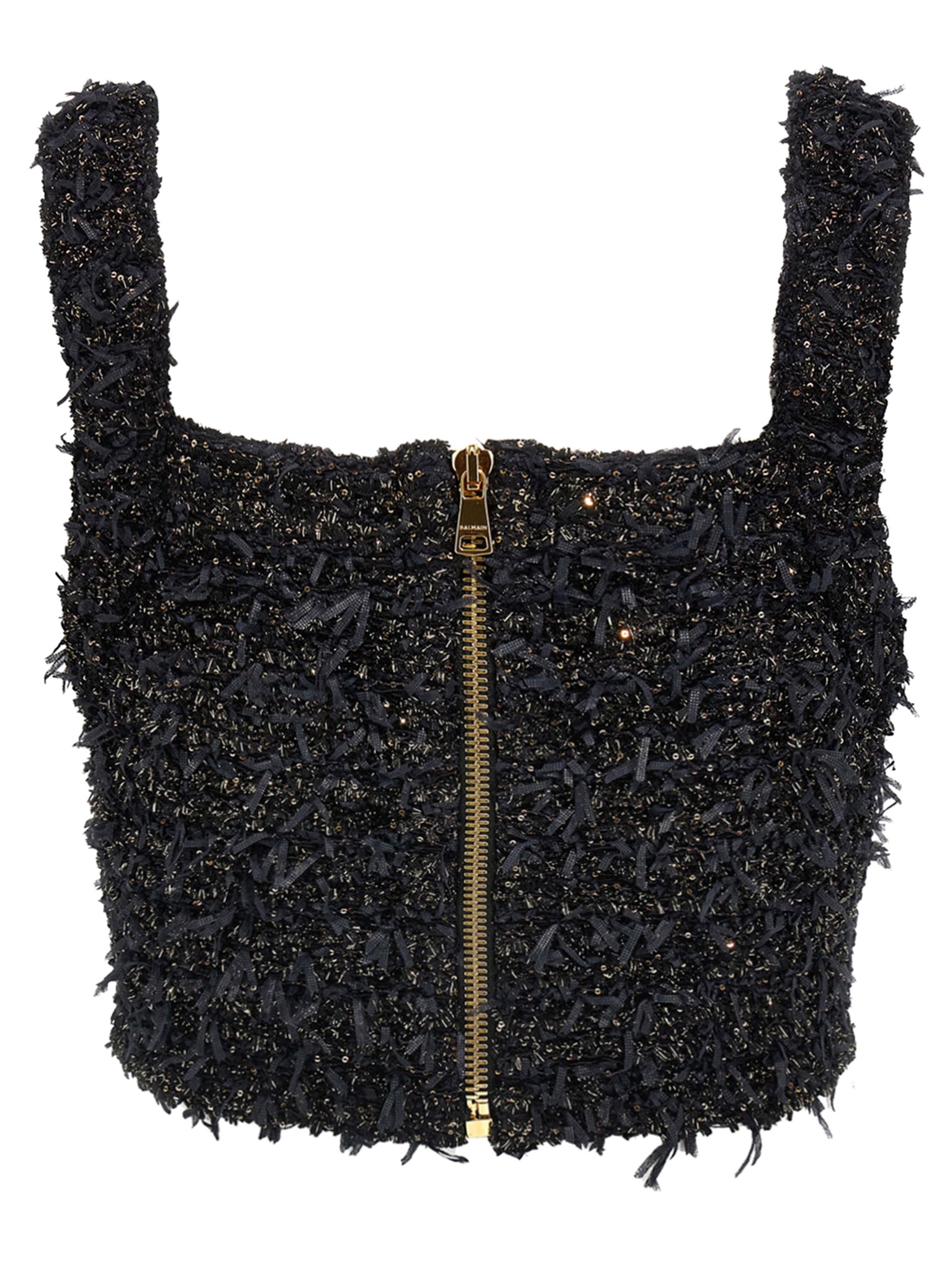 Tweed top with lurex threads, Crop style with thick shoulder straps and fringes, Front 'leone doppia catena' button appliqué, Back zip closure. Size and Fit - true to size fit French size
