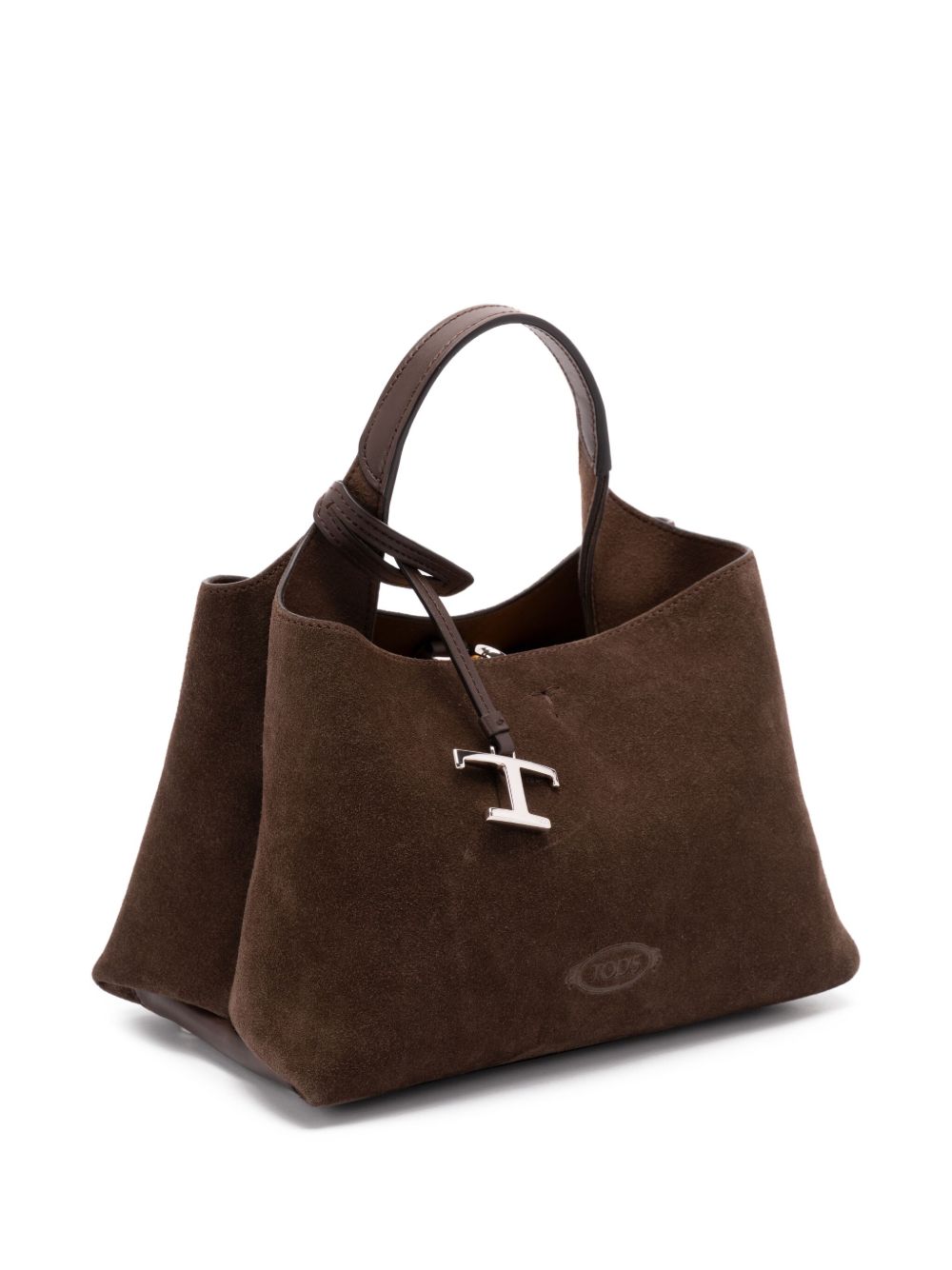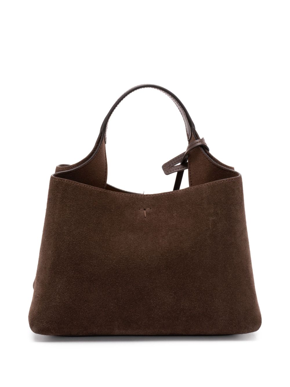 dark brown suede texture top handle detachable shoulder strap silver-tone logo charm leather base Micro leather tote bag Size and Fit - DEPTH: 14.5 Centimetres. HANDLE: 10.0 Centimetres. HEIGHT: 16.0 Centimetres. WIDTH: 24.0 Centimetres.
