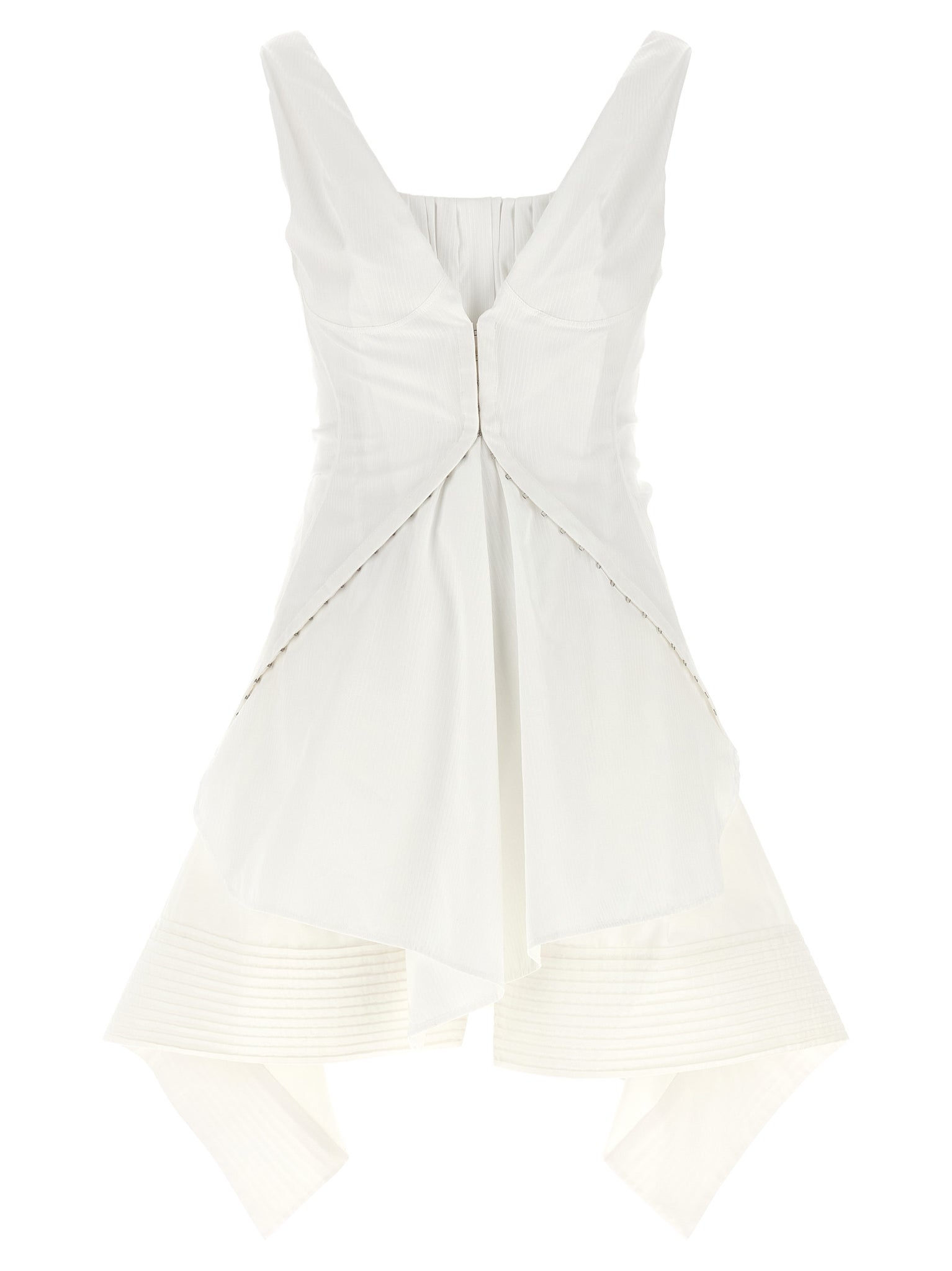 Mini 'day' dress in striped cotton poplin, Folded front part with adjustable hook closure, Pleats and pleats to create front and back curls, Preformed cup, Wide front square neckline, Thick straps, Sleeveless, Back zip closure, Asymmetrical insert on the hem in cotton poplin with pleats, Asymmetrical hem. Size and Fit - True to size fit