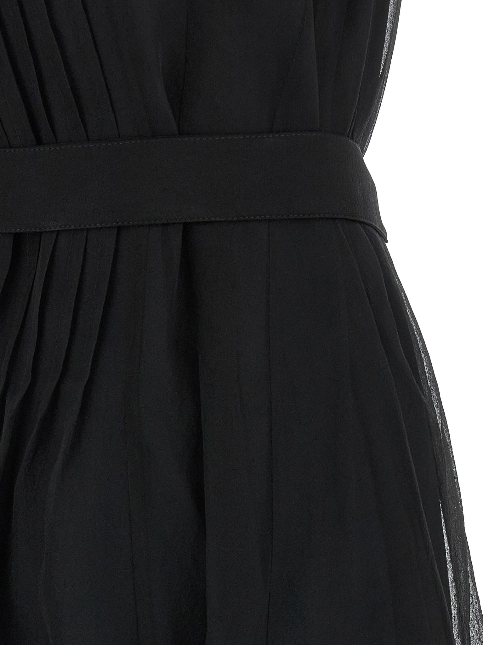 Long silk dress with pleats on the front and back, V-neck on the front and back with Monile detail on the back, sleeveless, integrated petticoat, removable matching belt. Size and Fit - true to size fit
