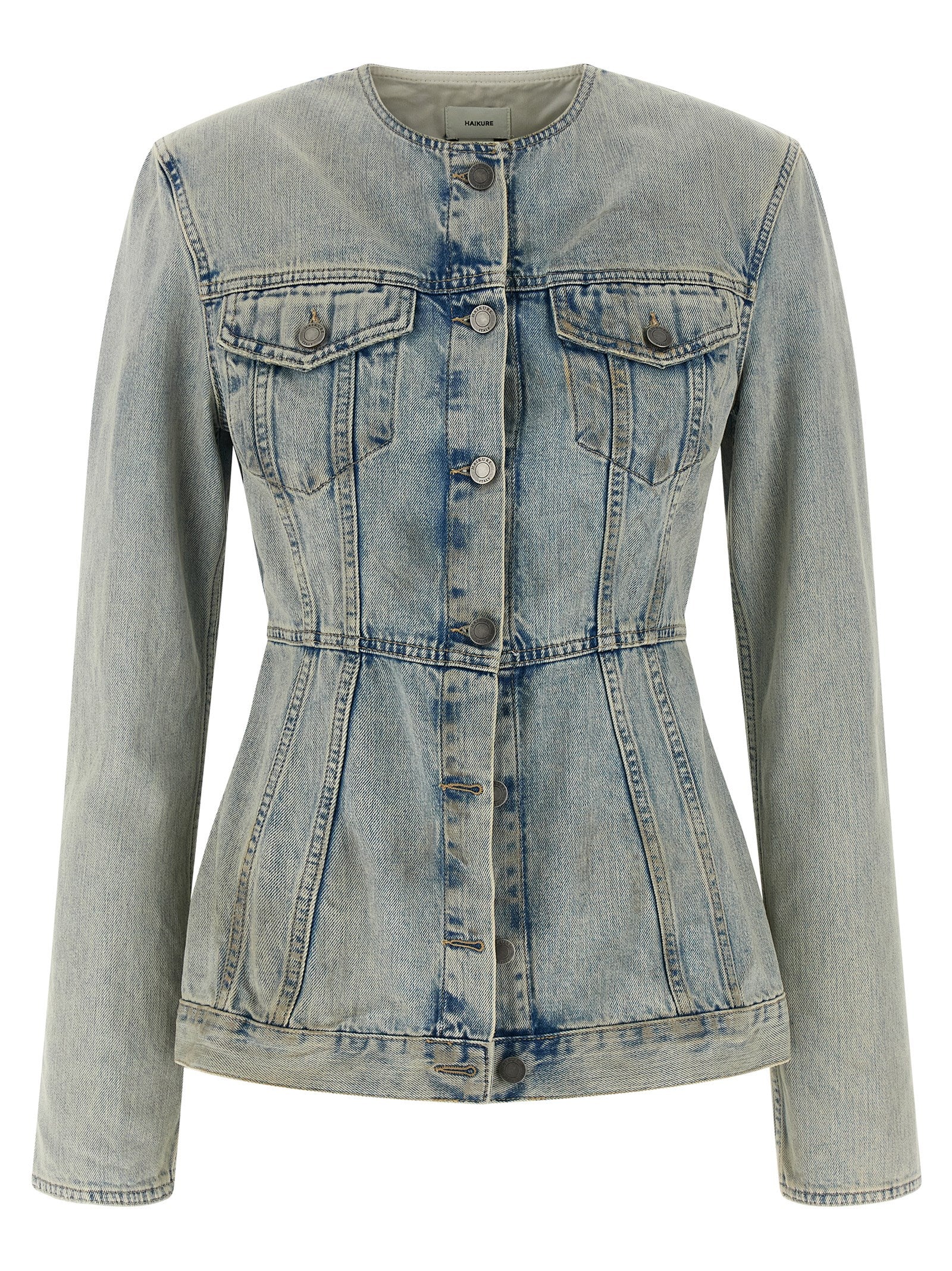'temple' unlined jacket in used-effect stone washed cotton denim with hourglass silhouette with marked waist, Crew neck, Front metal button closure, Pockets, Long sleeves with slit on the cuffs, And leather logo label on the back. Size and Fit - true to size fit