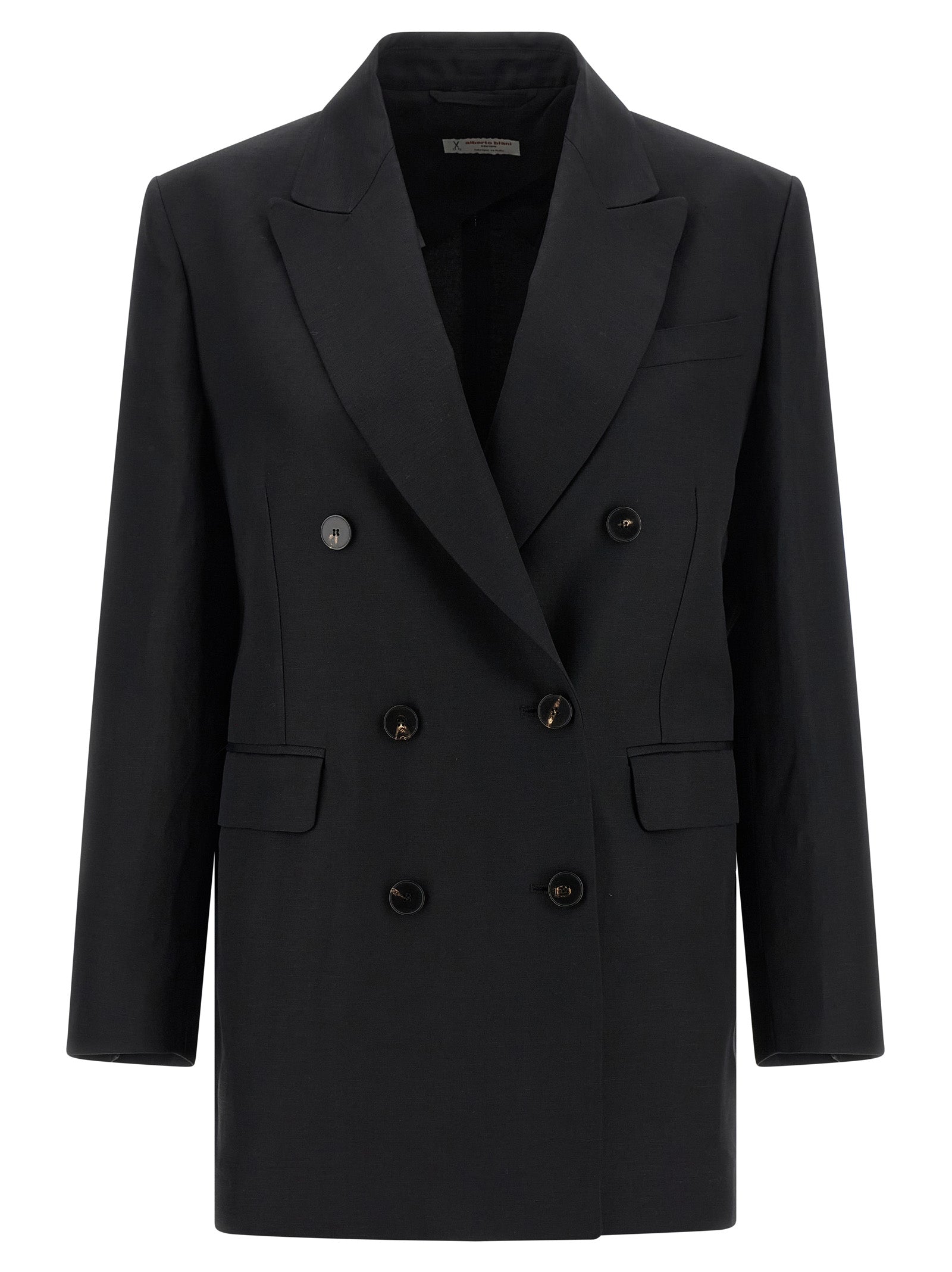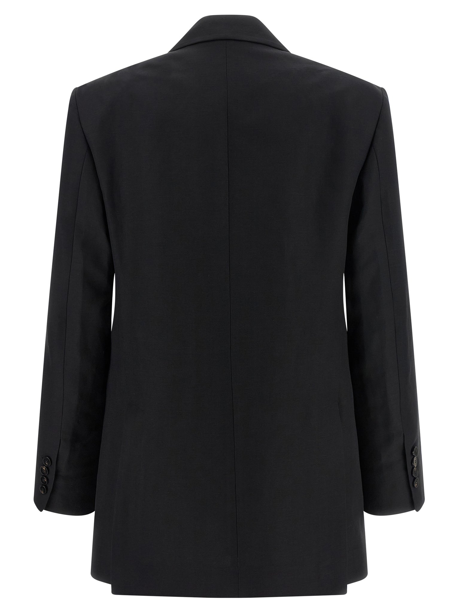 Double-breasted blazer in viscose and linen blend with front horn button closure, Peak lapels, Breast pocket, Flap pockets, Structured shoulder strap, Long sleeves, Back vents, Unlined. Size and Fit - true to size fit