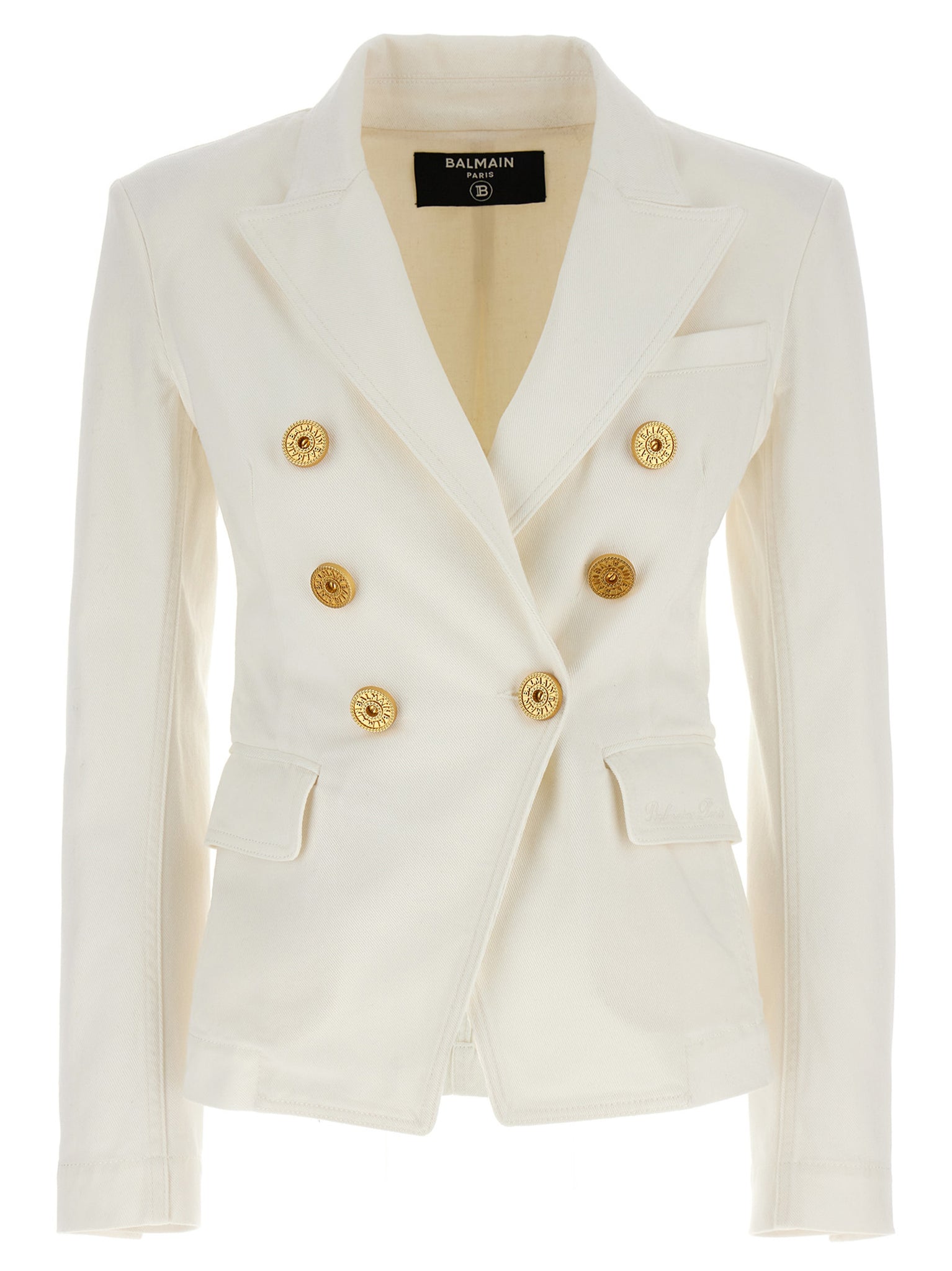 Double-breasted blazer in cotton denim with metal logo button closure, pockets, padded shoulders, long sleeves. Size and Fit - True to size fit French size