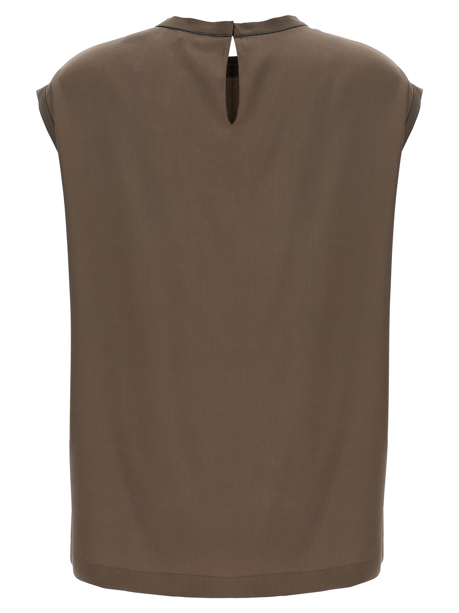 Sleeveless T-shirt in stretch silk satin with Monile detail on the back, with slightly dropped shoulders, button closure with cut-out detail at the back. Size and Fit - Comfort fit