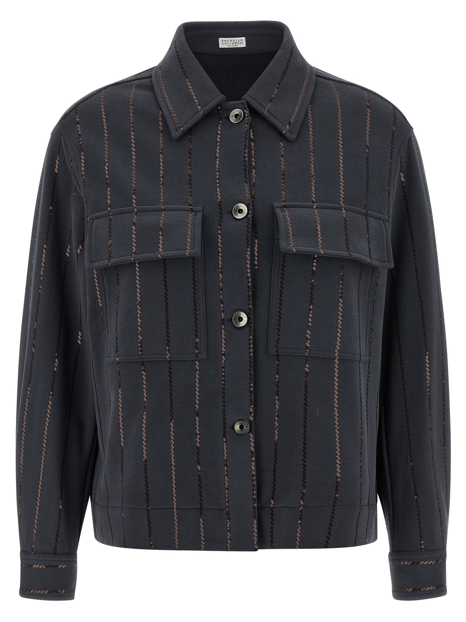 Cotton fleece shirt with striped sequin detail, collar, front button closure, pockets, long sleeves with cuffs. Size and Fit - True to size fit
