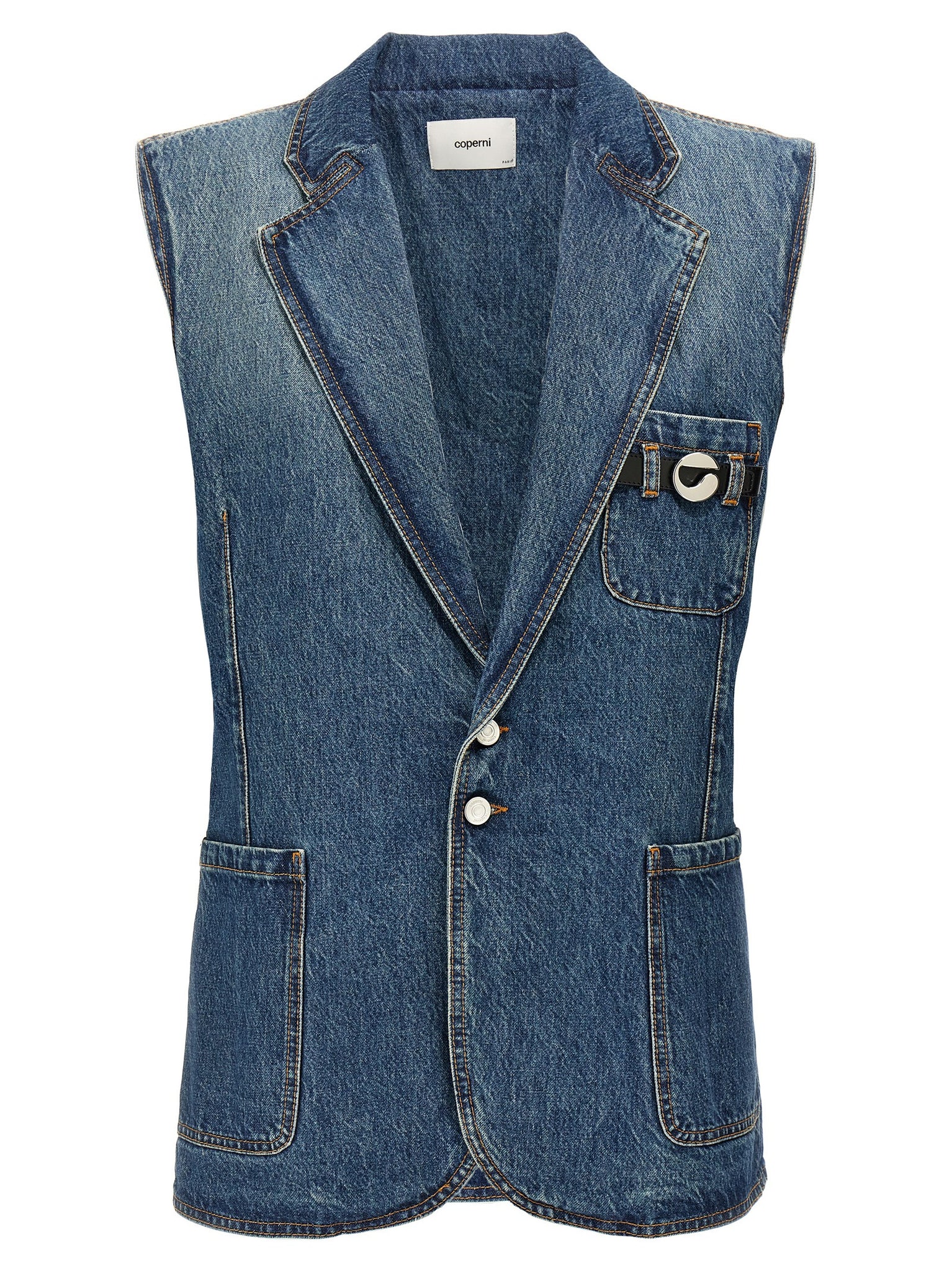 Delavé cotton denim vest, pocket with strap detail with front metal logo, mirror lapels, button closure, pockets, back vent. Size and Fit - Comfort fit