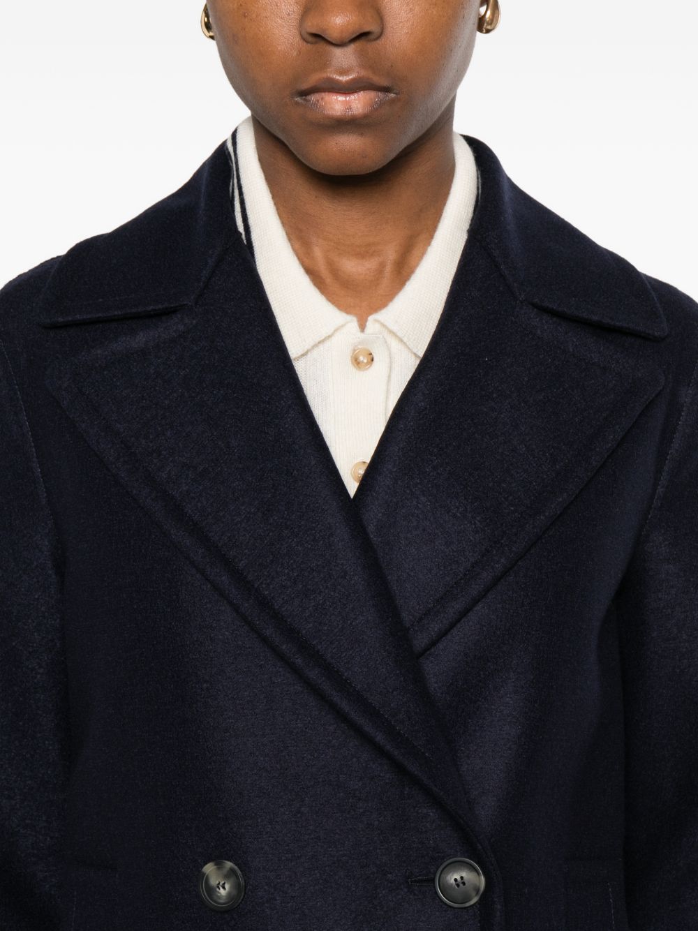 blue double-breasted notched lapels front flap pockets button fastening Wool coat