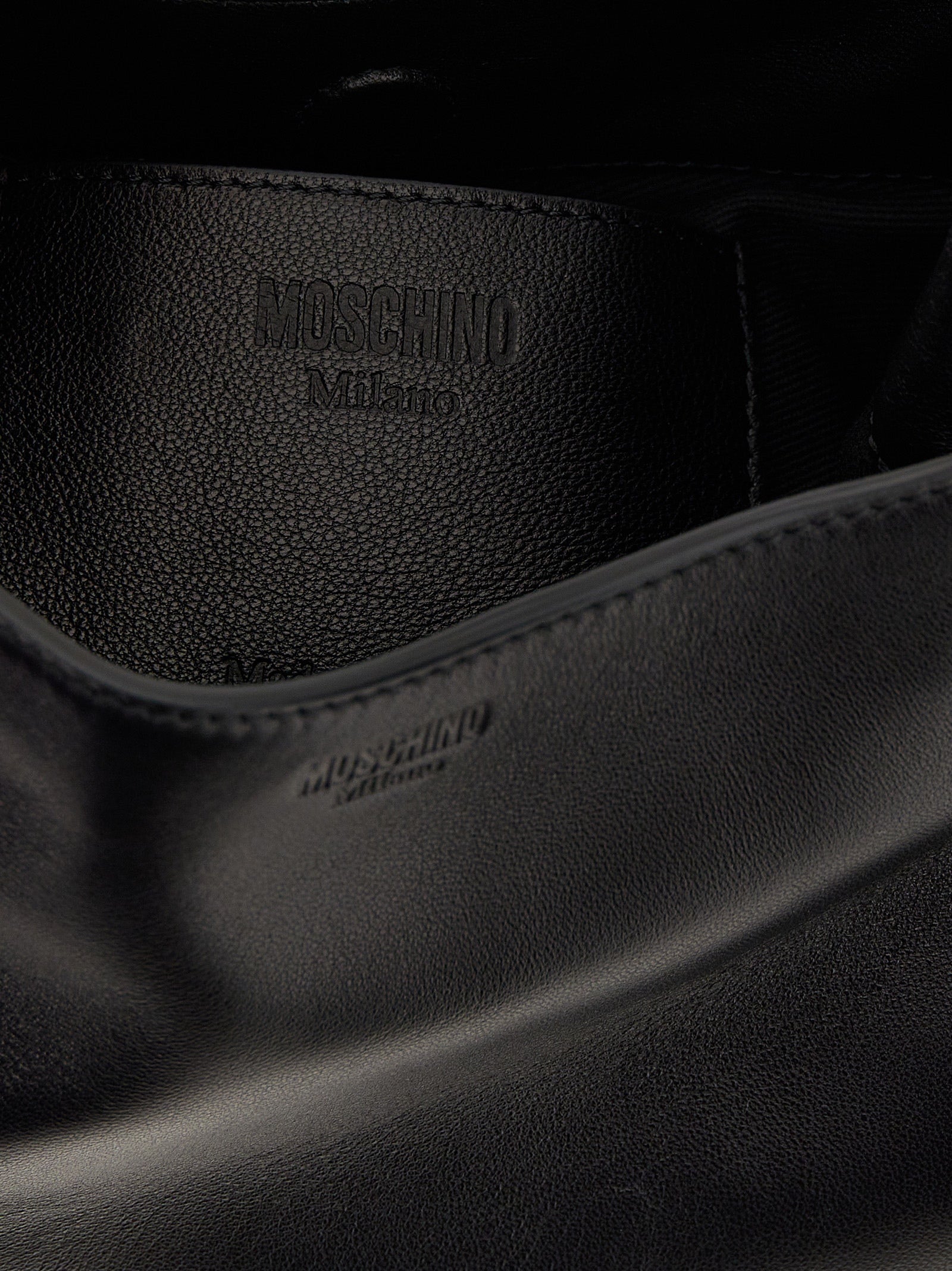 'Moschino Handle Me bag Small' nappa leather handbag with adjustable decorative belt with metal logo, front embossed logo, handle with tubular metal, magnetic closure, adjustable and removable shoulder strap. Size and Fit - W 21 x H 18.5 x D 8 cm