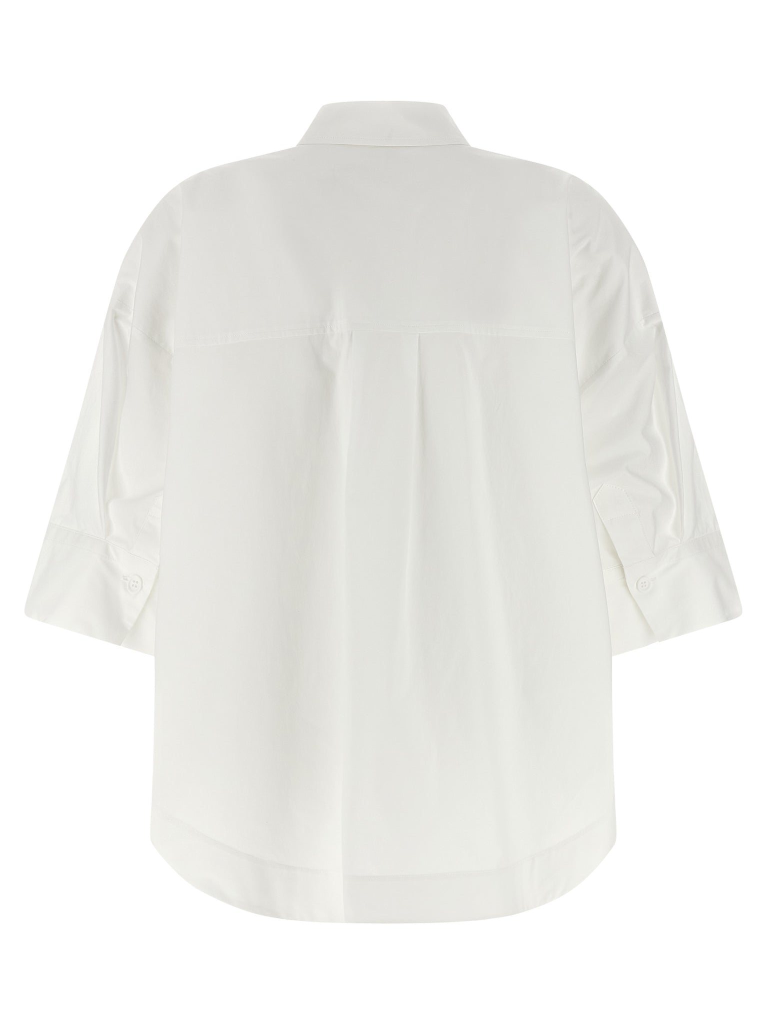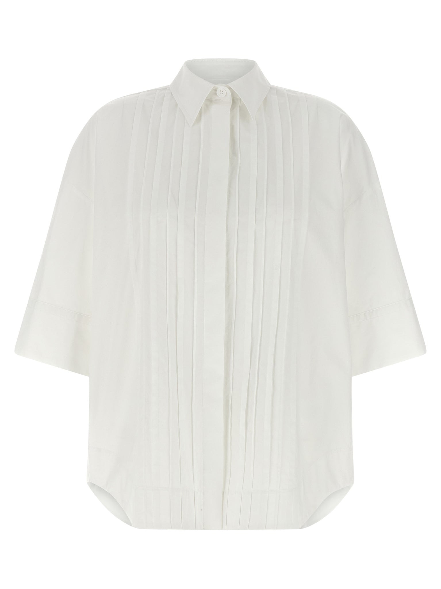 'canyox26' shirt in cotton poplin, Pleated and front button closure, Wide short sleeves with cuffs, Rounded and asymmetrical hem. Size and Fit - oversized fit