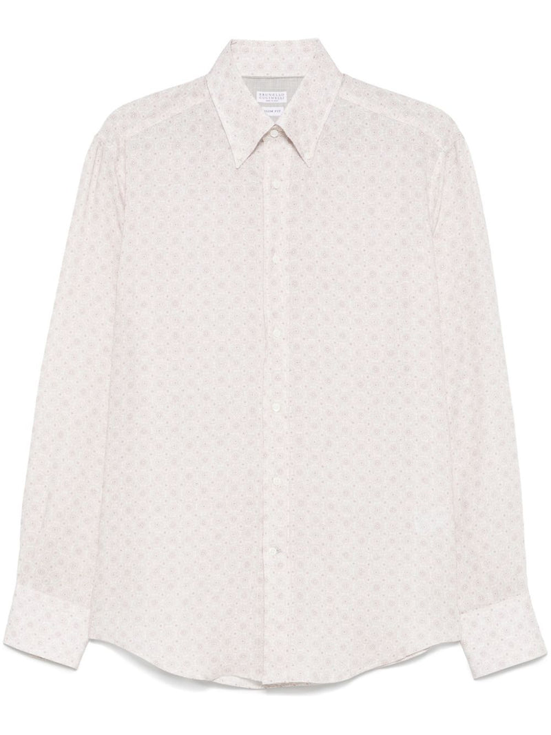 This Brunello Cucinelli printed shirt in light beige offers a refined silhouette with a pointed flat collar, front button fastening and buttoned-cuff sleeves that end in a curved hem. Crafted for adult men, the shirt balances subtle patterning with neutral tones for easy pairing across wardrobes. Size and fit follow standard measurements; the model is 1.84m and wears size M.