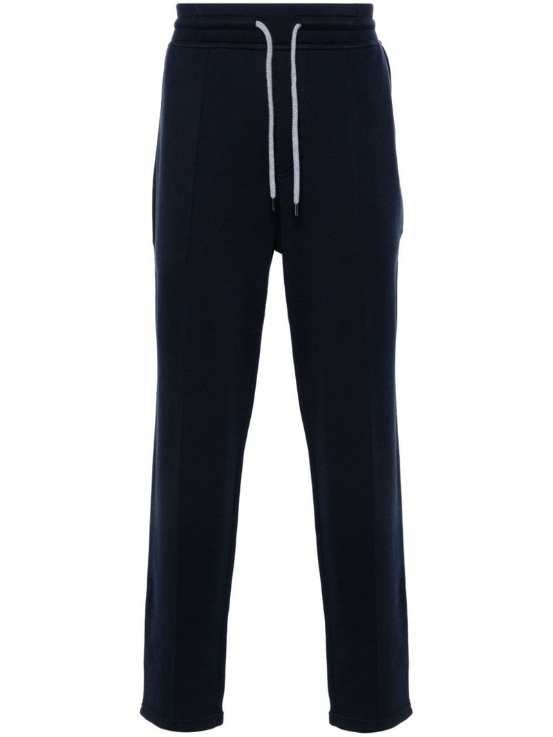 These Brunello Cucinelli trousers in blue cotton cashmere combine soft jersey comfort with a tailored tapered leg for a refined casual look. The elasticated, drawstring waist and side welt pockets offer practical ease, while rear jetted pockets and raised seam detailing keep the silhouette structured. Designed to fit true to size, the piece balances luxury fibers with everyday wearability for a versatile wardrobe staple.