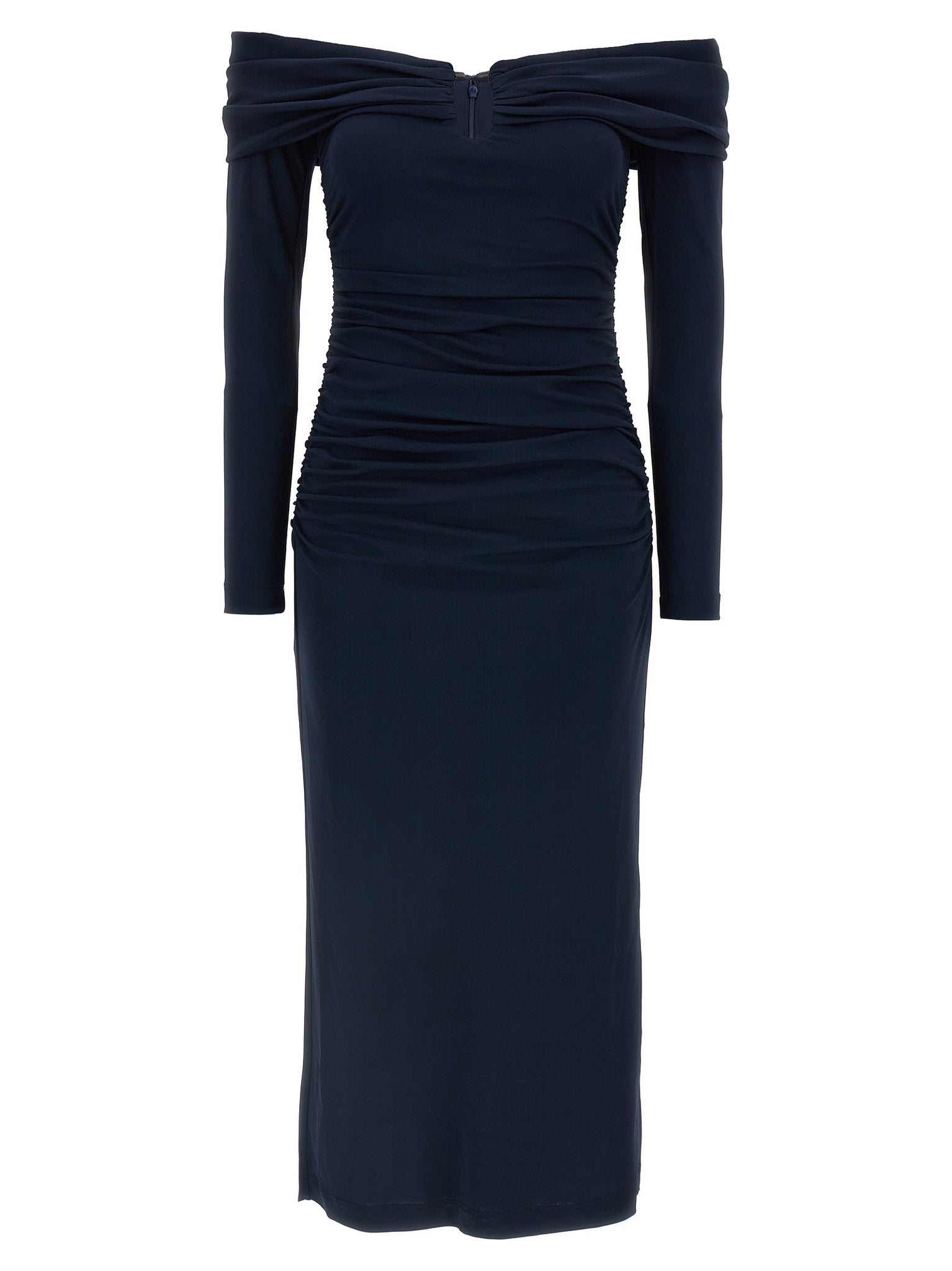 Off-the-shoulder 'off-shoulder 3/4 slv ruched midi' fluid fabric dress with rigid u-neck and dropped shoulder straps, 3/4 sleeves, Front and back draping, Back zip closure, Underskirt. Size and Fit - true to size fit