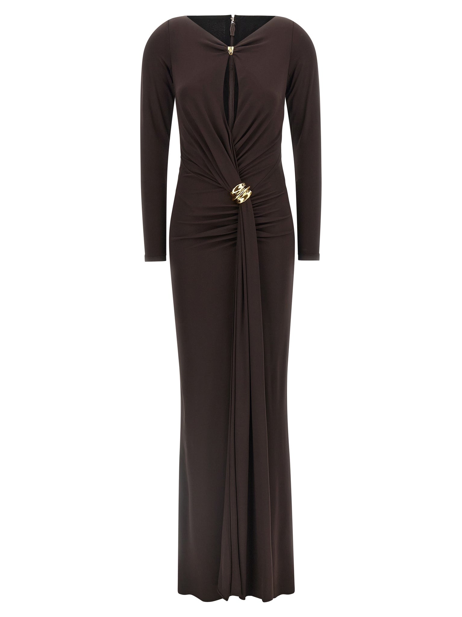 Long 'Red Carpet' dress in crêpe jersey, V-neck with teardrop cut-out detail and jewel knot stop on the front to create drapes, long sleeves, wide front slit, back zip closure. Size and Fit - Slim fit
