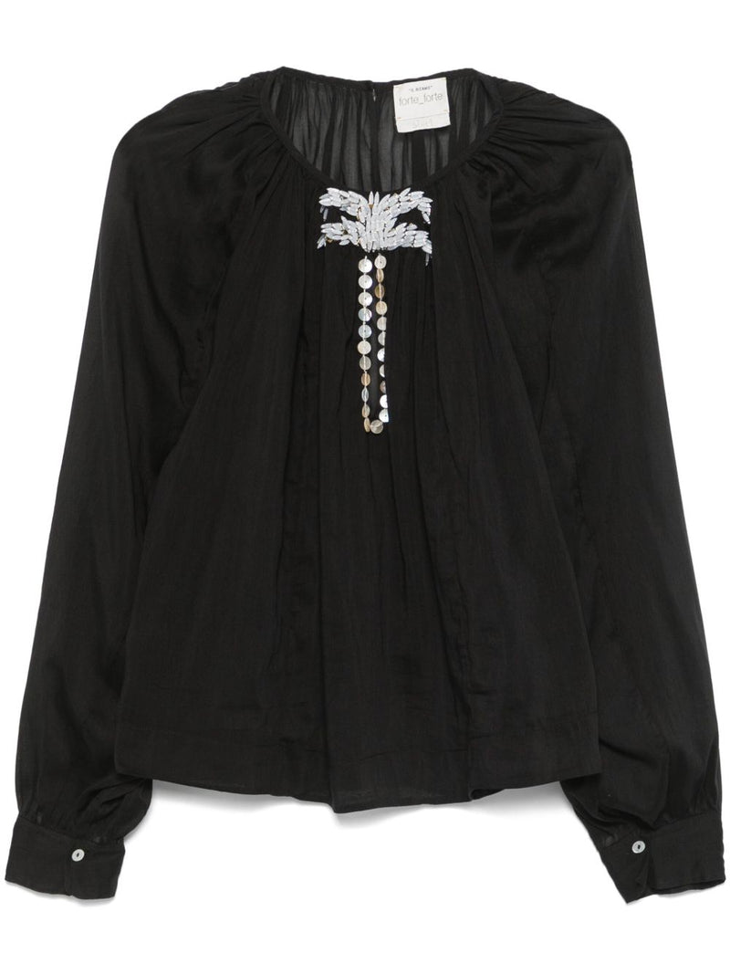 The Forte Forte black semi-sheer shirt offers airy coverage with a refined keyhole neck and single rear button fastening for a clean back profile. Buttoned-cuff sleeves provide polished shaping while the lightweight construction layers easily under jackets or over camisoles. This piece fits true to size; model is 1.75m / 5ft 8in wearing size 1. Care for delicate fabrics to preserve the semi-sheer finish and silhouette.