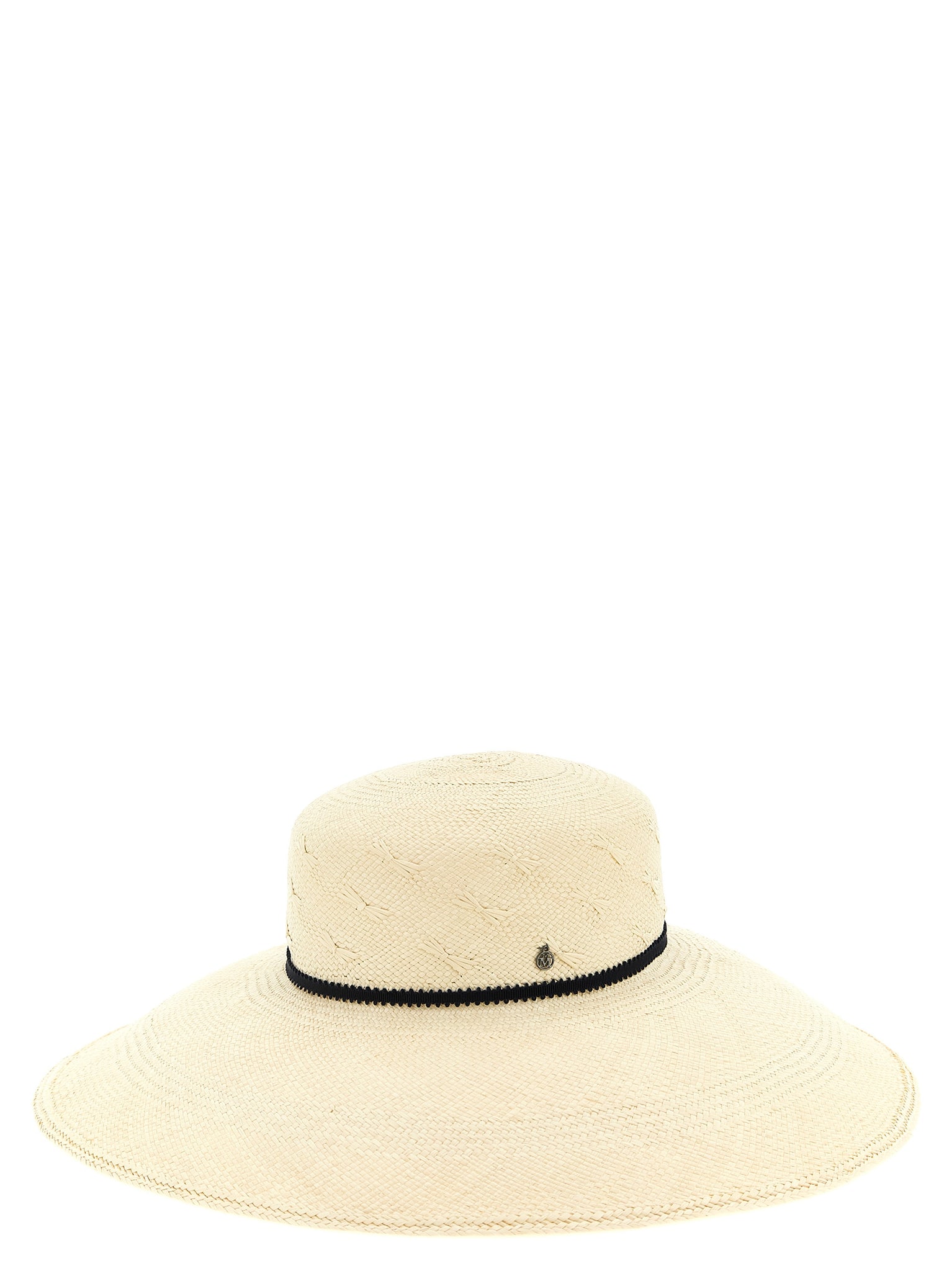 'rena' hat in natural brisa straw with knotted effect weave, Wide-brimmed caplin style with contrast black ribbon and metal logo. Handcrafted product, Any imperfections are to be considered characteristics of uniqueness. Size and Fit - true to size fit S: 56 cm M: 58 cm W: 60 cm