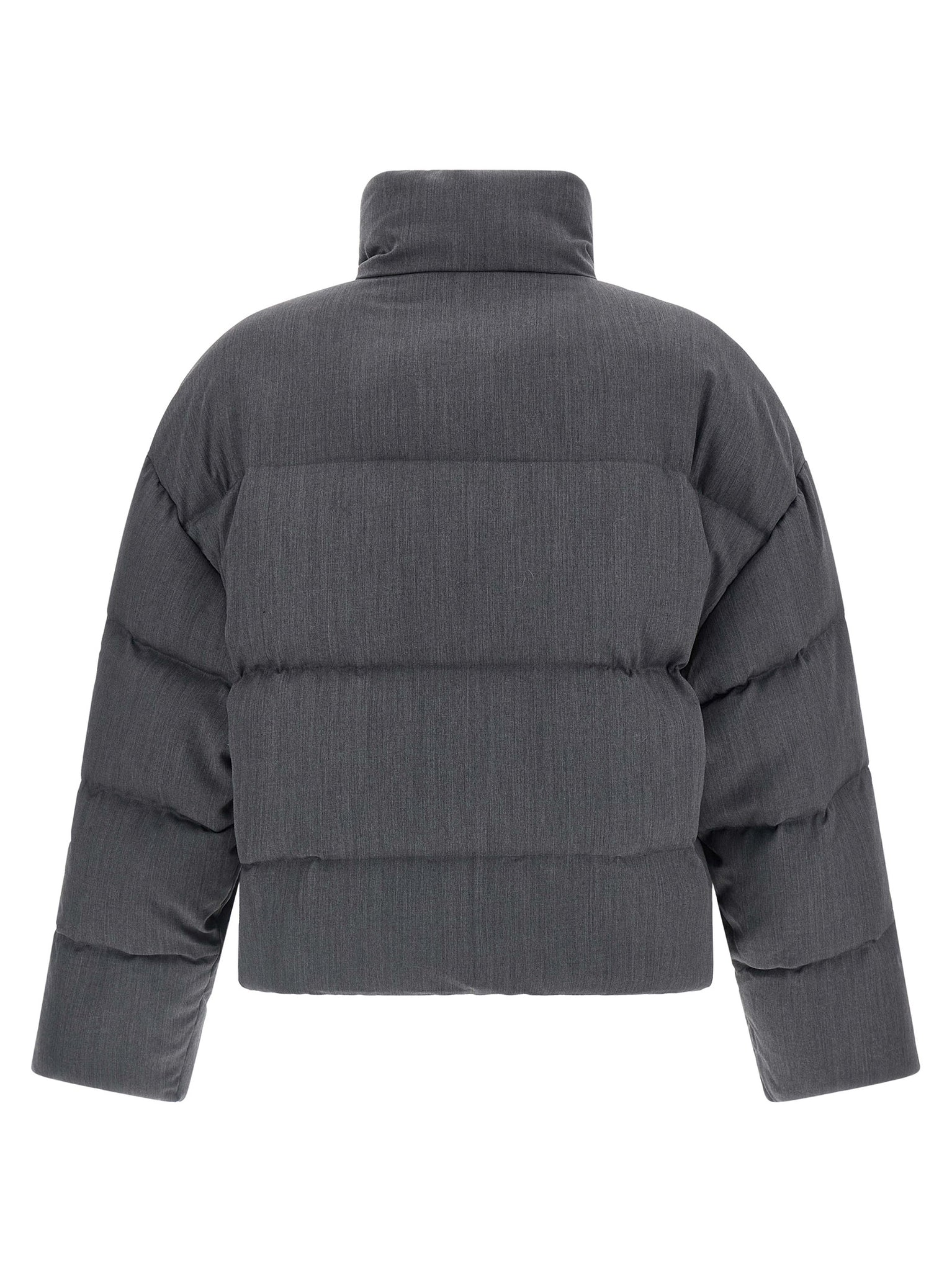 'MML Puffer' quilted mélange wool down jacket with goose feather padding, standing collar, front zip and velcro closure, pockets, long sleeves with windproof cuffs and dropped shoulders, drawstring on the hem. Size and Fit - Comfort fit