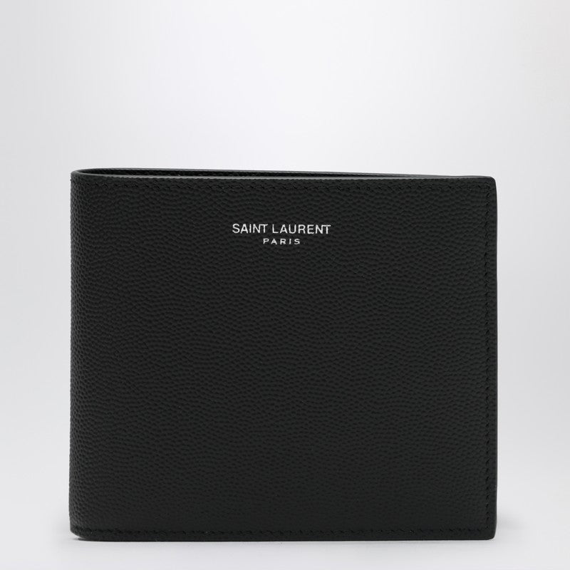 Wallet by Saint Laurent in black grain de poudre leather, featuring contrasting embossed front logo lettering, four card slots, two receipt compartments and one coin pocket with flap and snap button closure. Size and Fit - Larghezza 11,5 cm x Altezza 9,5 cm x Profondità 1,5 cm