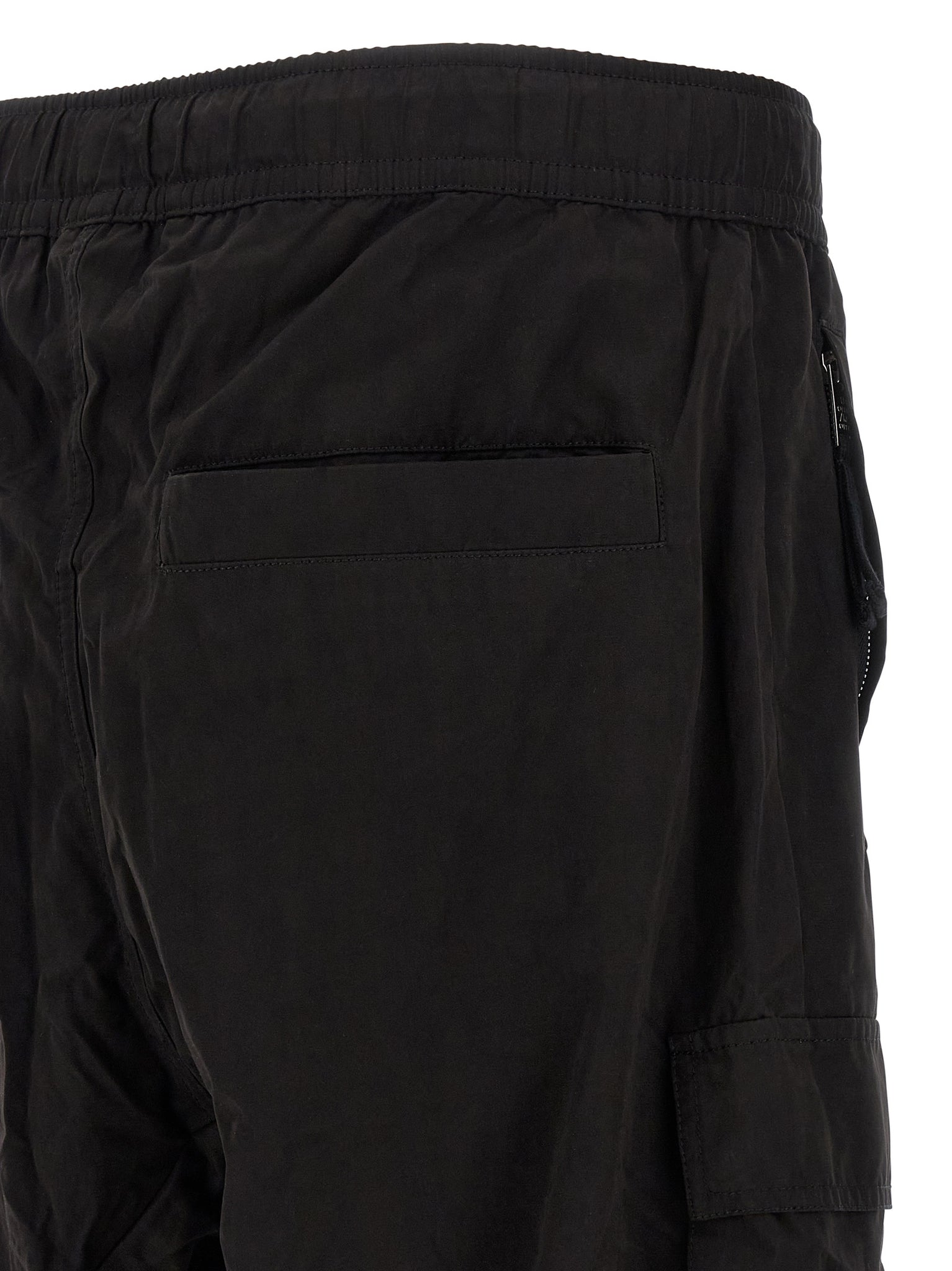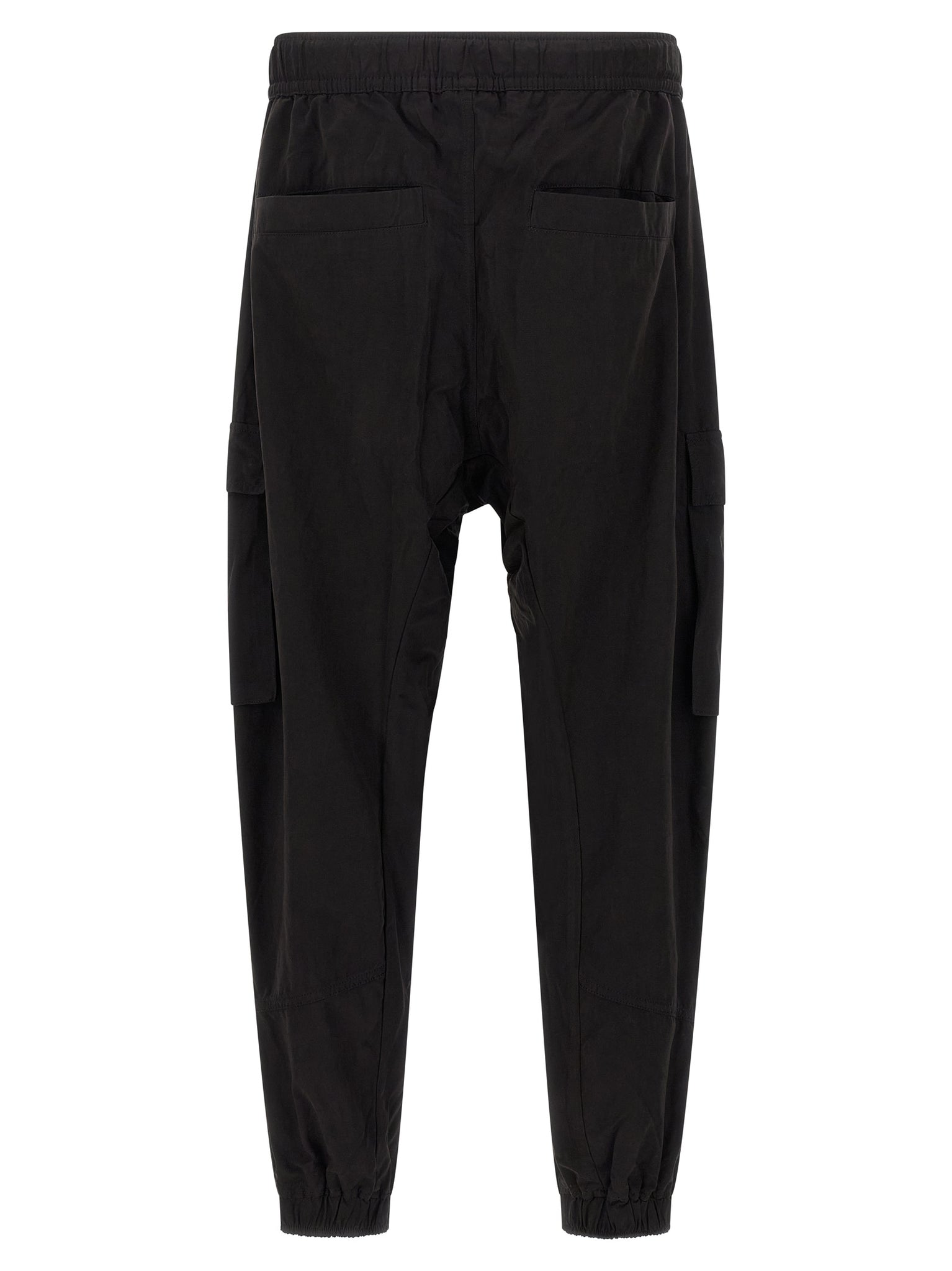 'M P 15' cargo pants in peached cotton blend with side pockets, low crotch, elastic waistband with integrated belt with cinch closure, flap with snap buttons, pockets, wide leg that tightens at the ankle with elastic cuffs. Size and Fit - true to size fit