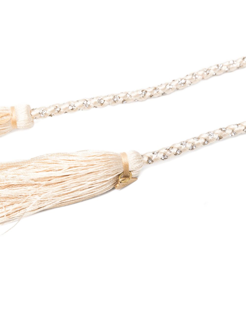 beige braided design crystal embellishment tassel detail Crystal and tassels belt Size and Fit - TOTAL LENGTH: 182.0 Centimetres. WIDTH: 4.0 Centimetres.