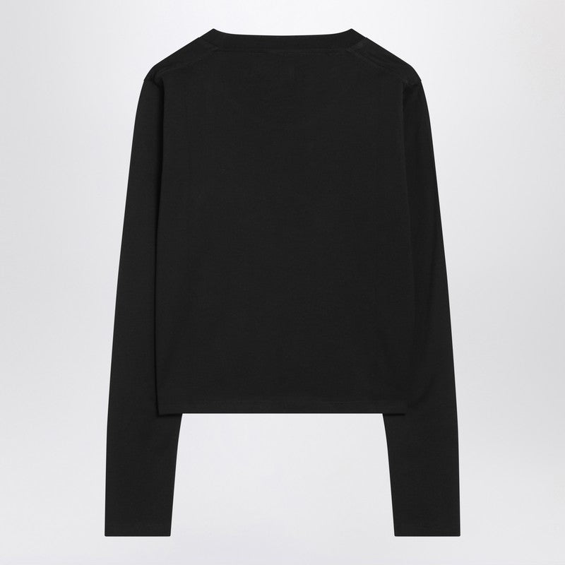 Discover a refined black cotton crew-neck T-shirt from Loulou Studio that balances everyday comfort with tailored structure, featuring a ribbed collar and long sleeves for versatile layering. The fabric offers breathable wear while maintaining shape, making it suitable for casual or elevated looks. Model wears size S; measurements: Height 179 cm, Chest 82 cm, Waist 65 cm, Hips 90 cm.