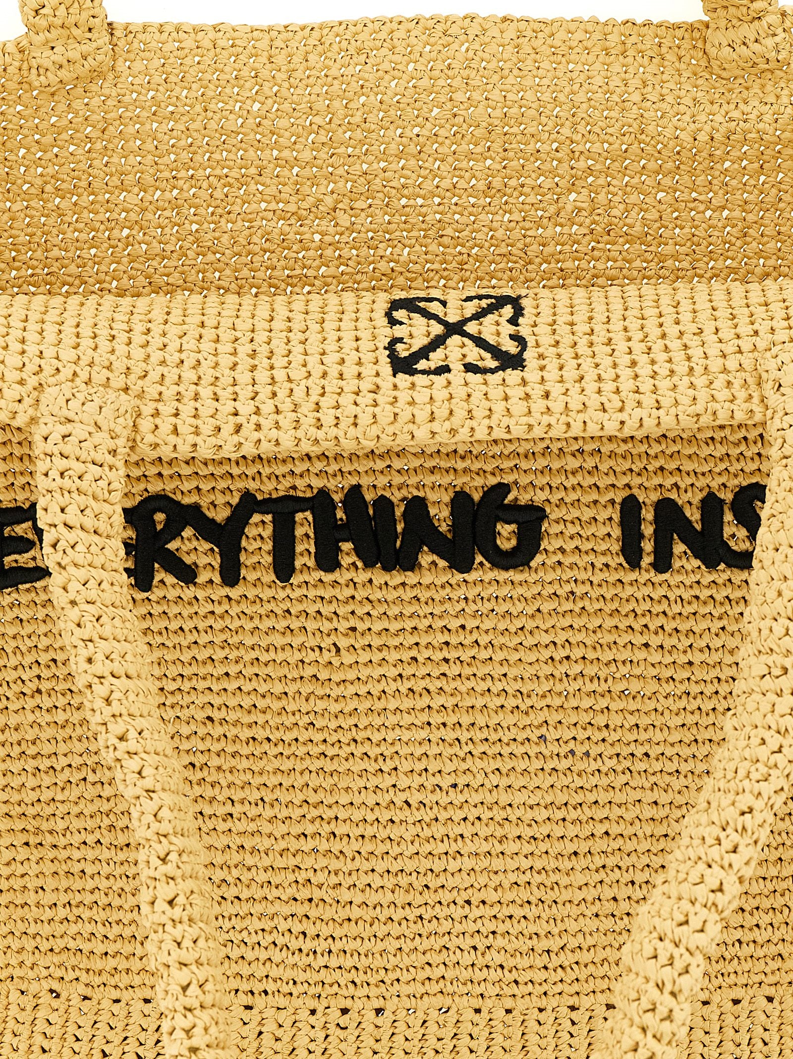 Discover the Off White Jitney Shopping Bag in beige woven raffia-effect fabric, designed with contrast front embroidery and a double fixed handle for reliable wear. This handcrafted shoulder bag offers roomy daily carry at W 56 x H 41 cm while natural imperfections emphasize its unique character. Lightweight and structured for easy use, it pairs practicality with artisanal detail for adult female wardrobes.