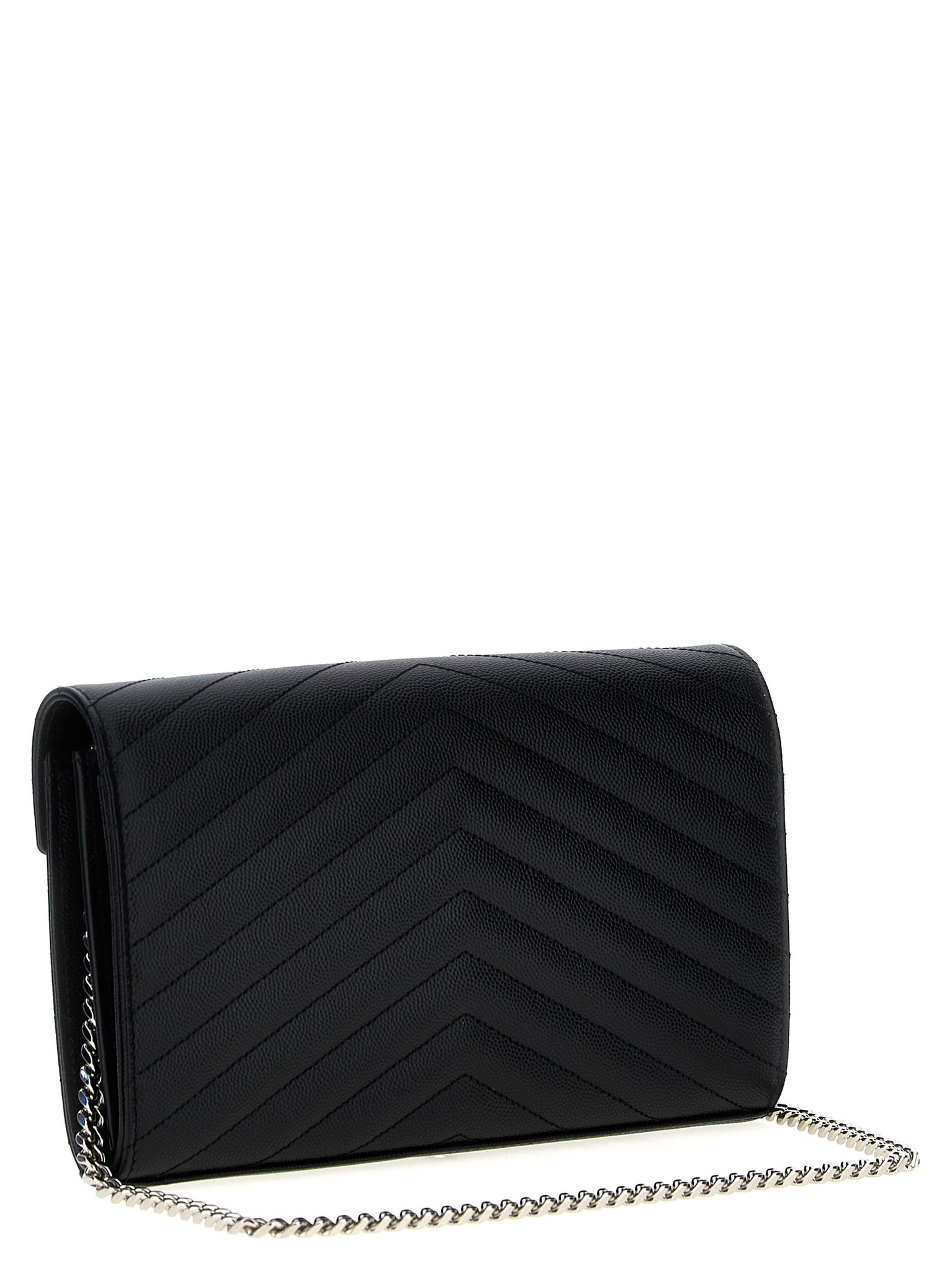 Cassandre' quilted grain de poudre leather clutch bag, Magnetic flap closure with front metal logo appliqué, And removable chain shoulder strap. Size and Fit - W 22.5 x H 14 x D 4 cmMade in: Italy
