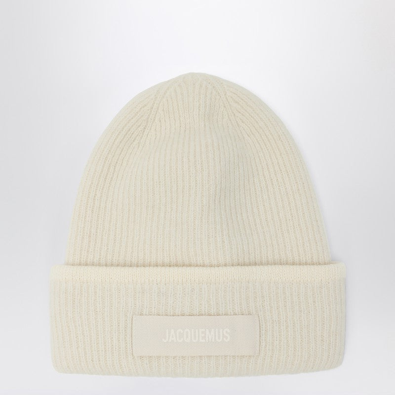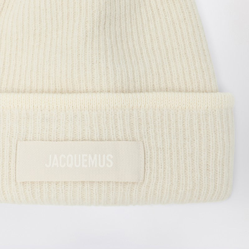 Jacquemus ribbed wool beanie in off-white color, with a cuff and a leather label featuring the logo.