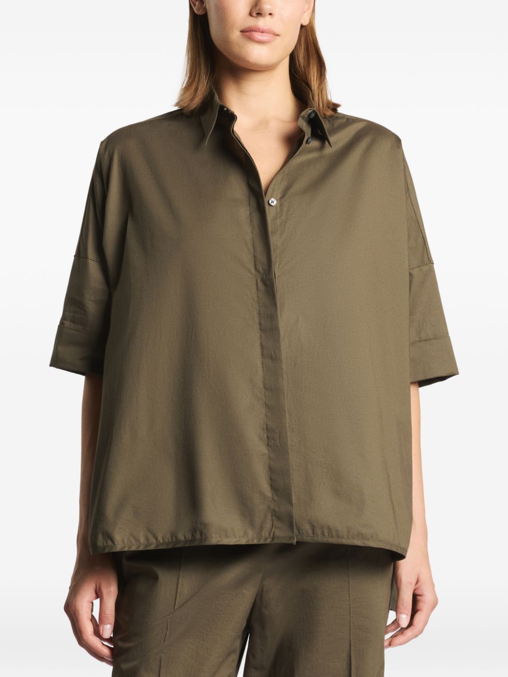 olive green point collar short sleeves button fastening Cotton shirt