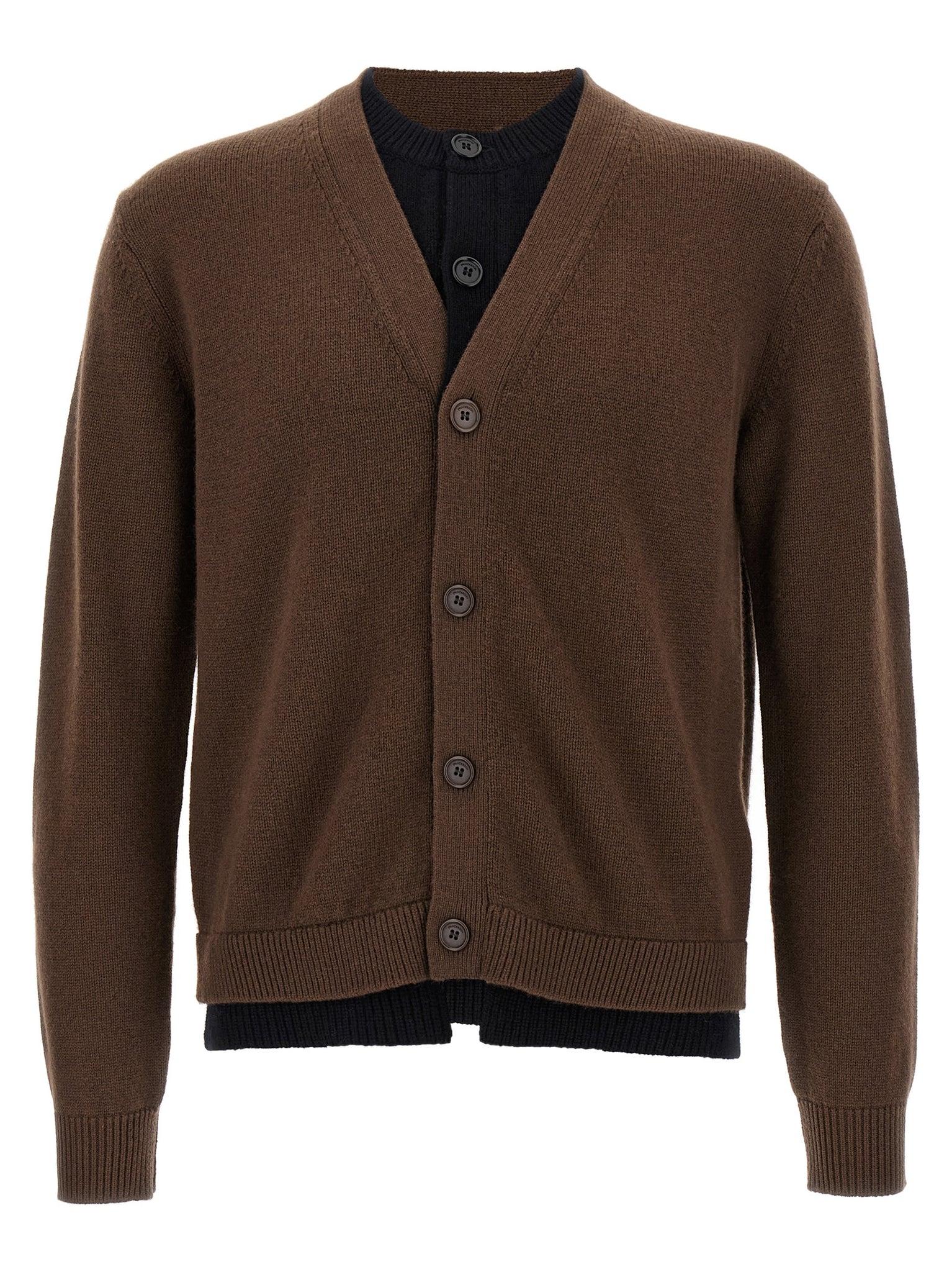 'contrast layered' wool and cashmere blend cardigan, Consisting of two contrasting layers, The lower one with round neckline and button closure, The upper one with v-neck, Button closure and long cuffed sleeves, Asymmetrical hem. Size and Fit - true to size fit