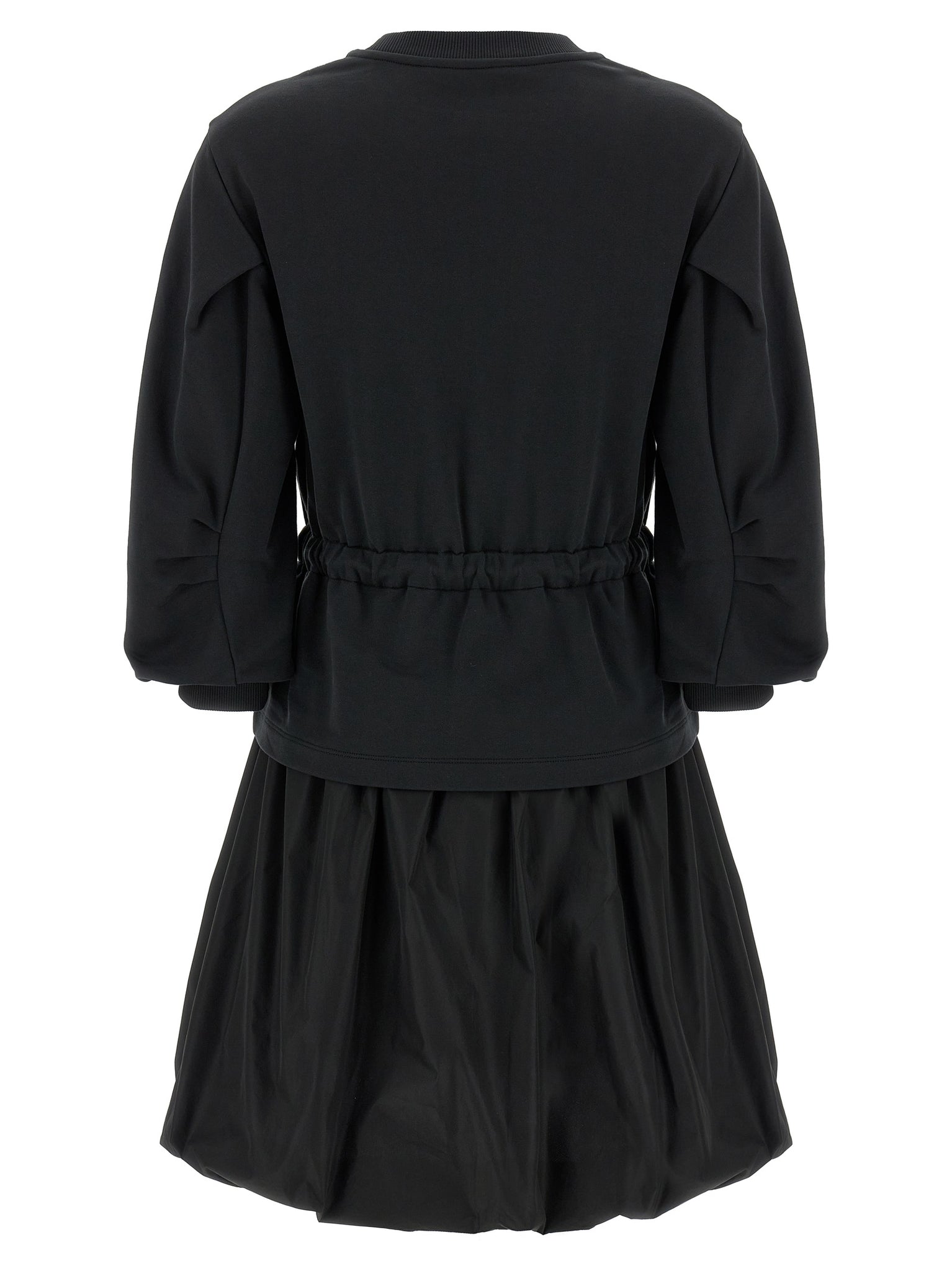 The Moncler Two-material Dress pairs a brushed cotton top with a balloon-style skirt in double technical fabric for versatile wear; the drawstring waist lets you adjust the silhouette while a felt logo patch and breast pocket add signature details. Three-quarter sleeves finish with elastic curled cuffs and a crew neck for comfortable layering, and the mesh-lined skirt combines structure with breathability. True to size fit provides reliable sizing guidance for adult women seeking a refined casual dress in black.
