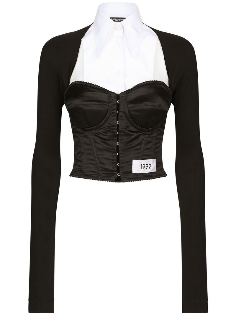 KIM DOLCE&GABBANA layered-shirt corset top from DOLCE & GABBANA featuring black, cotton blend, layered effect, corset style, oversized pointed collar, moulded cup, corset style, number patch to the front, boned bodice, front hook and eye fastening and long sleeves. Size and Fit - This piece fits true to size. We recommend you get your regular size. Model is 1,75m / 5ft 8in wearing size 40 (IT)