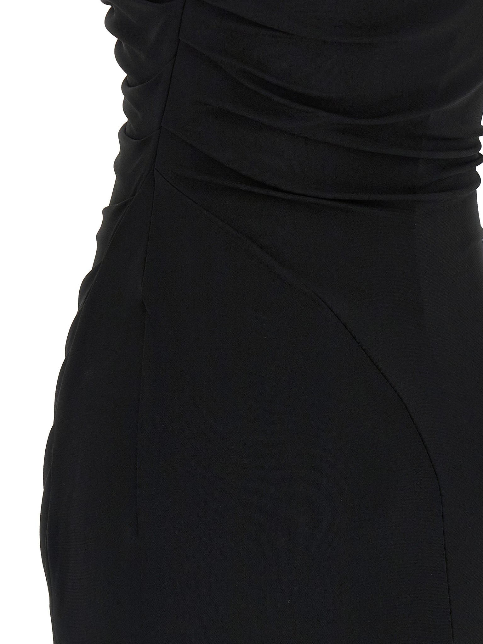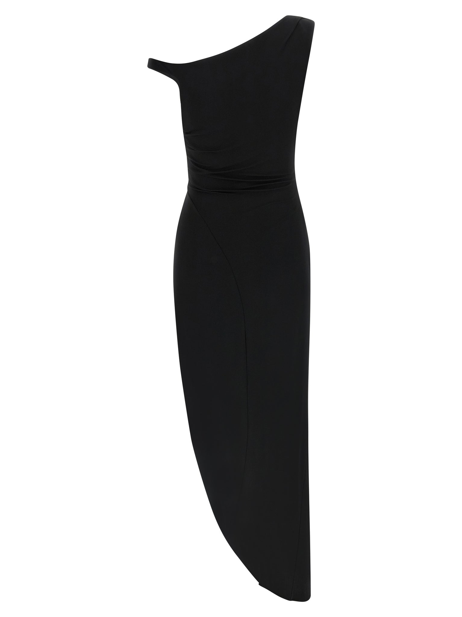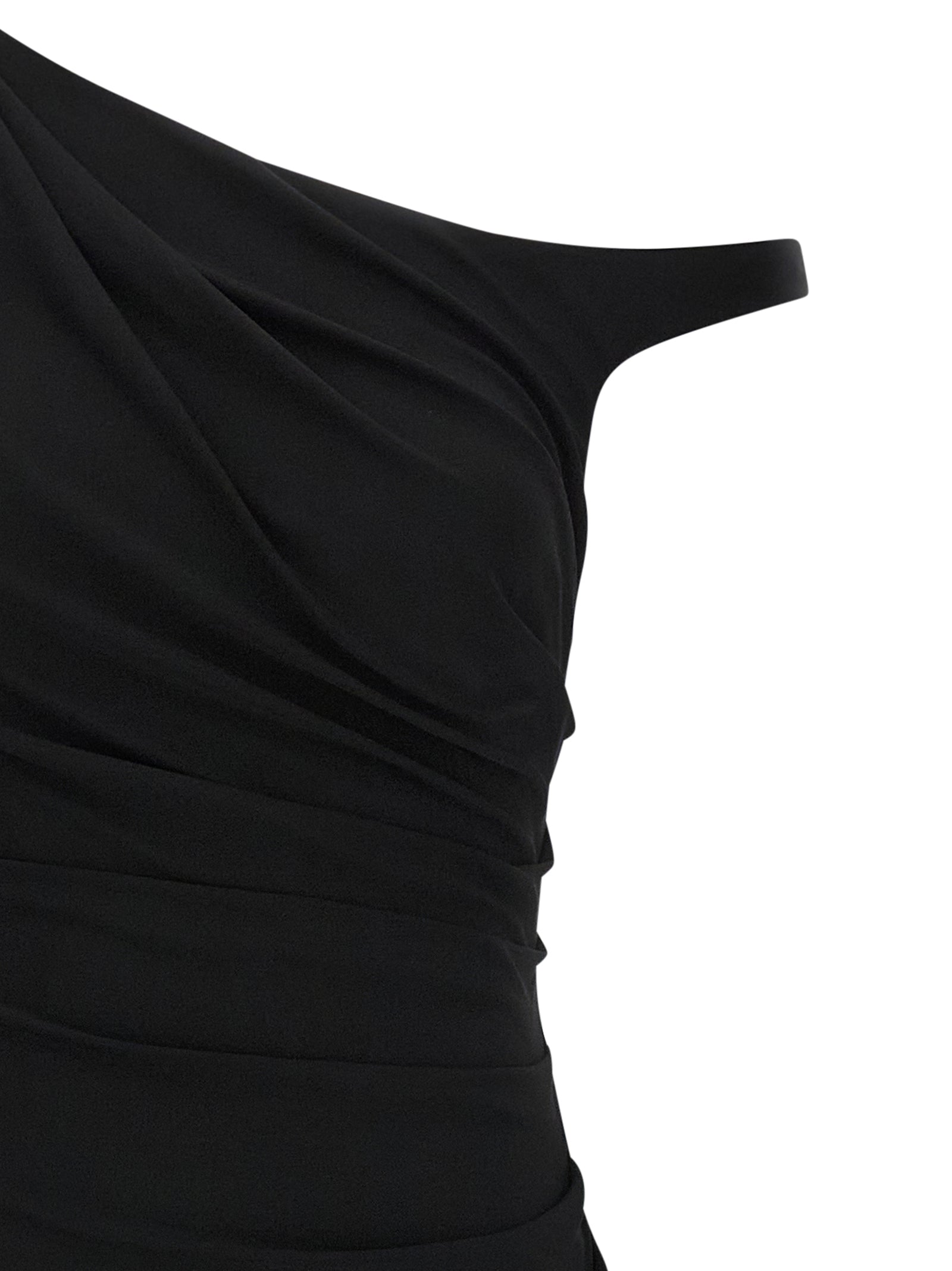 One-shoulder dress in crêpe jersey with jeweled padded shoulder strap, Boat neck, Drapes and side zip closure, And wide slit with asymmetric hem. Size and Fit - Slim fit