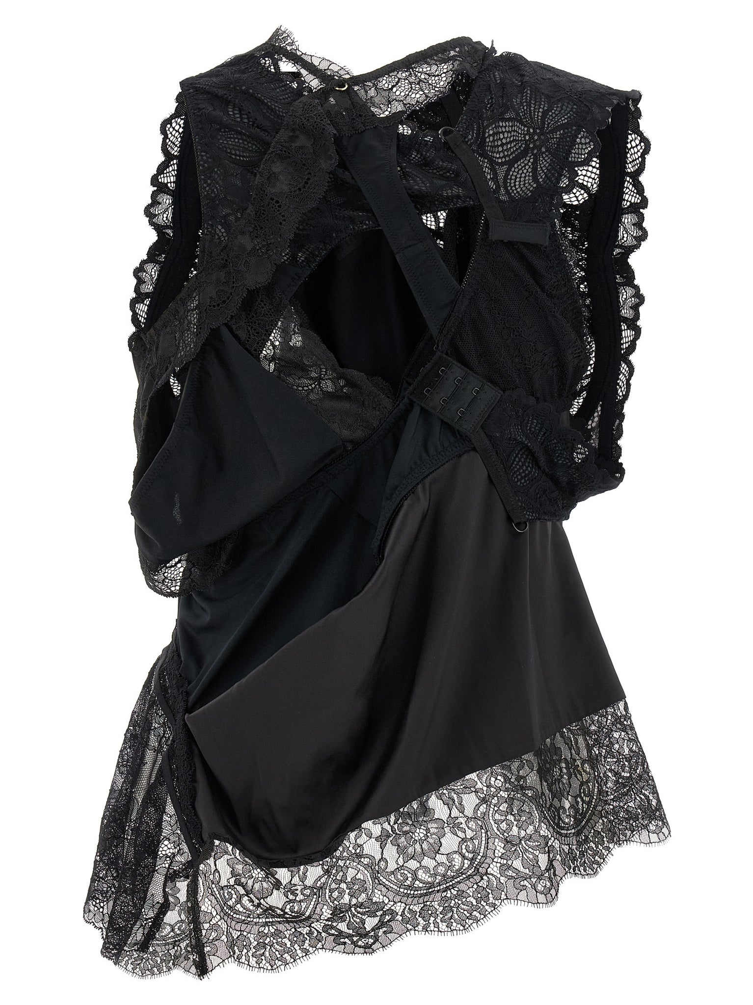 Junya watanabe x peach john satin top with tone-on-tone lace inserts, Asymmetrical construction with cut-out details at the back, Lingerie references, V-neck, And asymmetrical hem. Size and Fit - True to size fitMade in: Japan