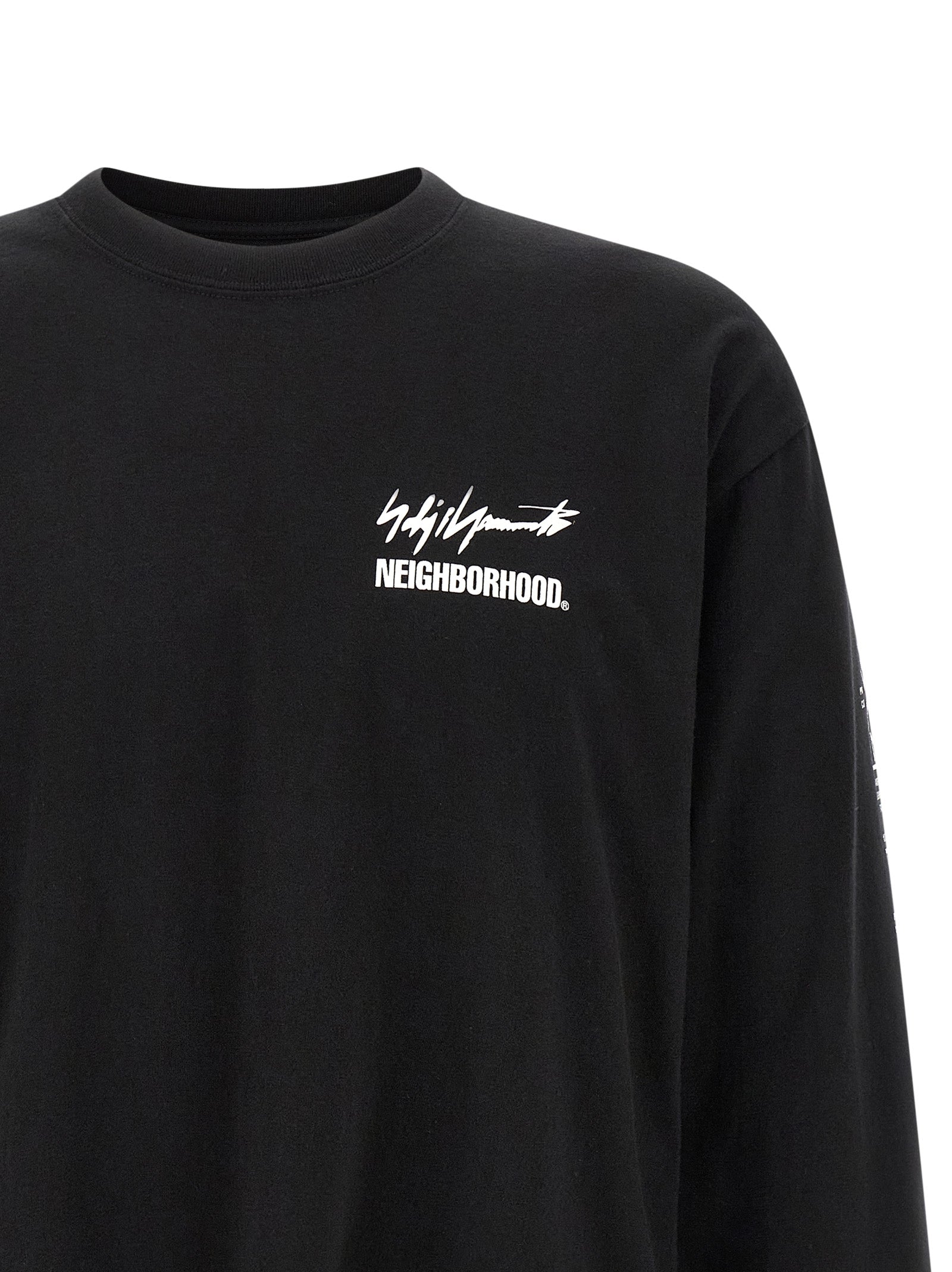 Yohji yamamoto × neighborhood 'ls tee' cotton crew neck t-shirt with logo print on the front and back and on the sleeve, Front logo patch, Long cuffed sleeves. Size and Fit - True to size fit
