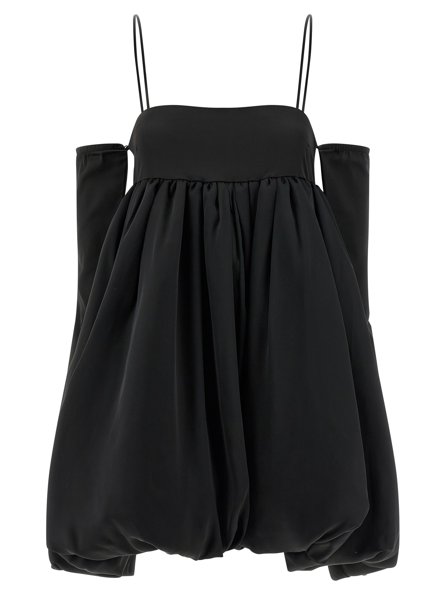 Satin le bubble' satin mini dress with balloon silhouette, Wide skirt, Thin straps, Back zip closure, Removable long sleeves with zip on the cuffs. Size and Fit - true to size fit - GERMAN size