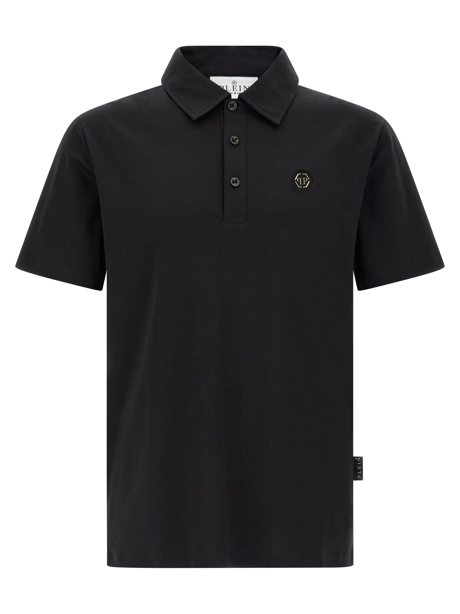 Discover a refined short-sleeve polo crafted in cotton jersey that balances comfort with a tailored look and true-to-size fit. The front hexagon patch and classic collar with buttons deliver signature detailing while side slits improve movement and ease. Ideal for smart-casual wardrobes, this black Philipp Plein piece pairs easily with chinos or denim for polished everyday wear.