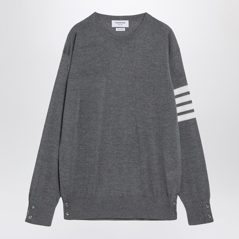 Thom Browne gray merino wool sweater, characterized by a crew neck design, 4-Bar detail on the sleeve, ribbed cuffs and hem. Size and Fit - Model wears size 5 Model measurements: Height: 185 cm Chest: 105 cm Waist: 85 cm Hips: 100 cm